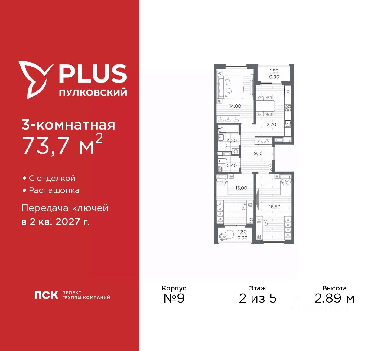 Трехкомнатная квартира от застройщика с отделкой в ЖК ''PLUS Пулковский'' на 2 этаже. Общая площадь: 73.7 кв.м., жилая: 43.5 кв.м., площадь просторной кухни-столовой: 12.7 кв.м. Квартира - распашонка, без проходных комнат, окна выходят на paзные стороны дома. В квартире две лоджии, один совмещенный и один раздельный санузел. Высота потолков 2.89 м.