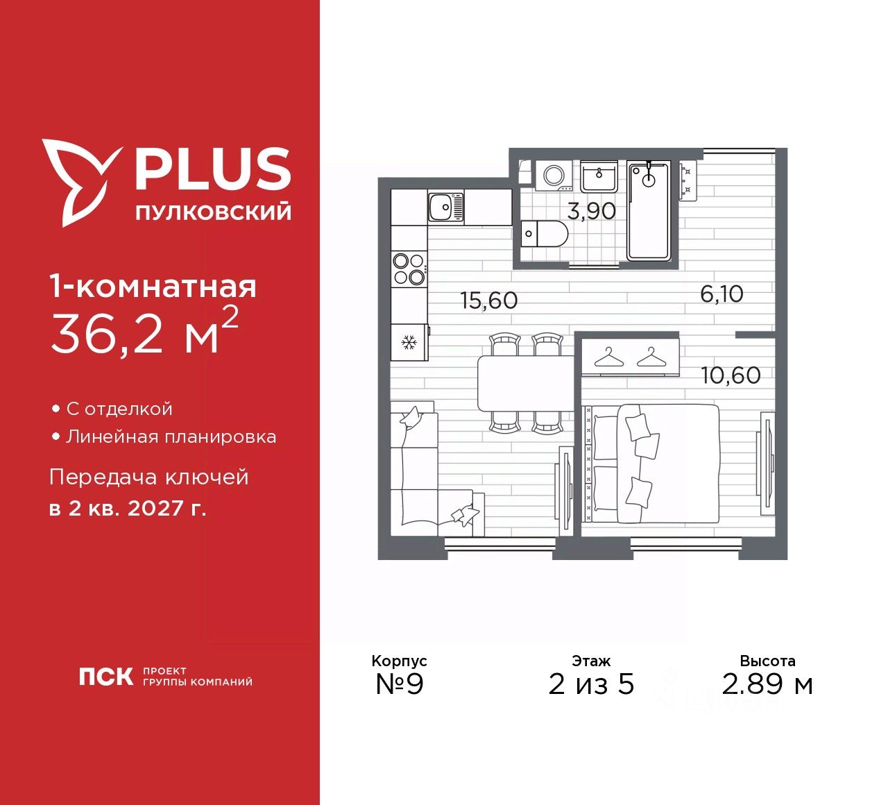 1-комн. квартира с отделкой в ЖК ''PLUS Пулковский'' на 2 этаже. Общая площадь: 36.2 кв.м., жилая: 12.7 кв.м., площадь просторной кухни-столовой: 14.7 кв.м. Все окна выходят на одну сторону. В квартире одна лоджия, один совмещенный санузел. Высота потолков 2.89 м.