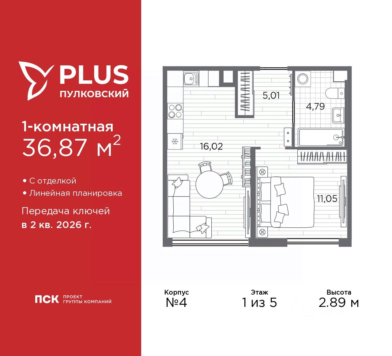 Просторная 1-комн. квартира с отделкой в ЖК ''PLUS Пулковский'' на 1 этаже. Общая площадь: 36.87 кв.м., жилая: 11.05 кв.м., площадь просторной кухни-столовой: 16.02 кв.м. Все окна выходят на одну сторону. В квартире один совмещенный санузел. Высота потолков 2.89 м.