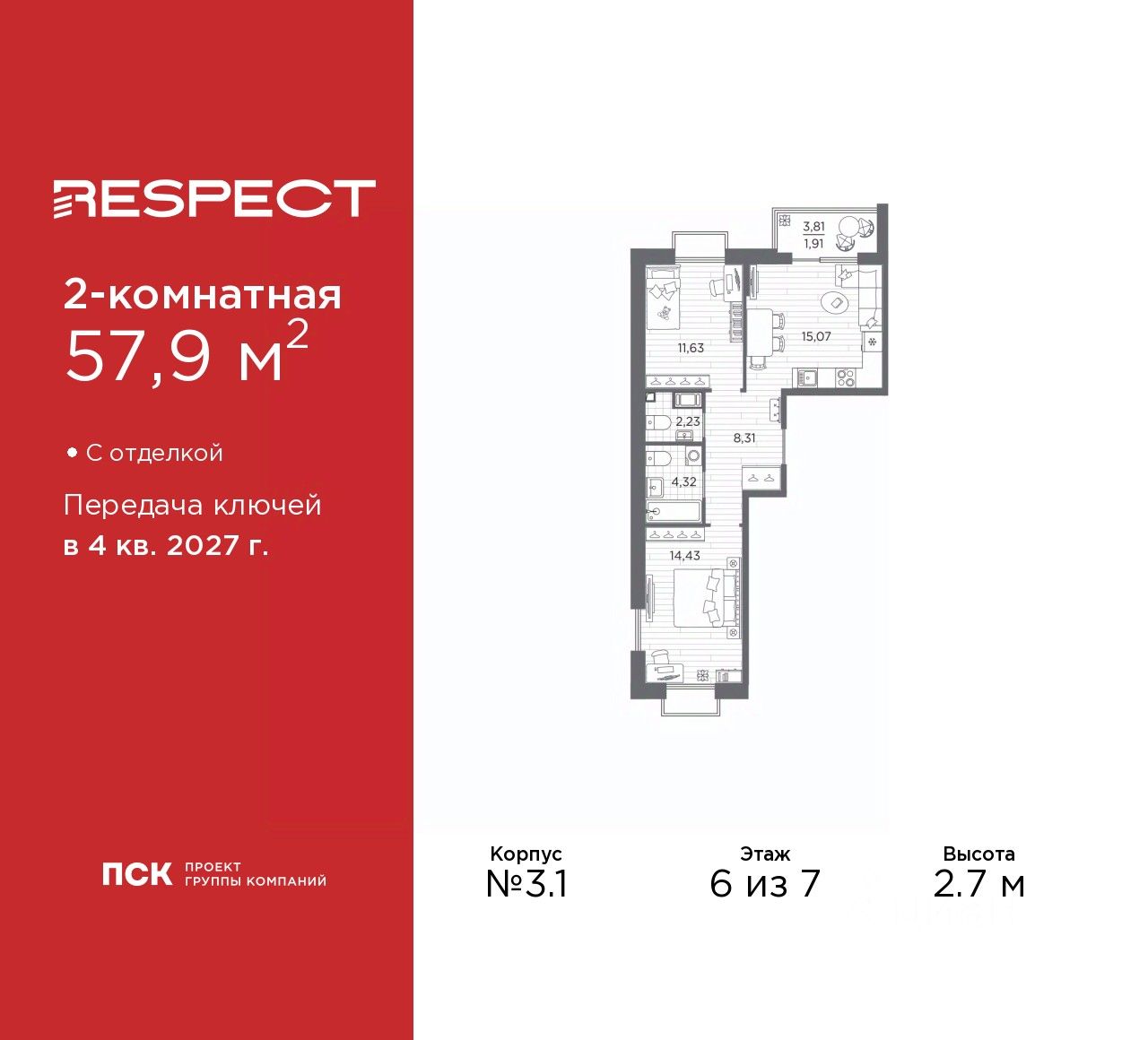 Просторная 2-комн. квартира с отделкой в ЖК ''RESPECT'' на 6 этаже. Общая площадь: 57.9 кв.м., жилая: 26.06 кв.м., площадь просторной кухни-столовой: 15.07 кв.м. Квартира без проходных комнат, окна выходят нa три cтopoны дома. В квартире один балкон, один совмещенный и один раздельный санузел. Высота потолков 2.7 м.