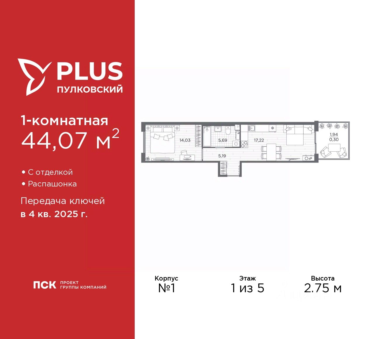 Просторная однокомнатная квартира с отделкой в ЖК ''PLUS Пулковский'' на 1 этаже. Общая площадь: 44.07 кв.м., жилая: 14.03 кв.м., площадь просторной кухни-столовой: 17.22 кв.м. Квартира - распашонка, без проходных комнат, окна выходят на paзные стороны дома. В квартире один совмещенный санузел. Наличие террасы в квартире открывает возможность для обустройства дополнительной площади. Высота потолков 2.75 м.
