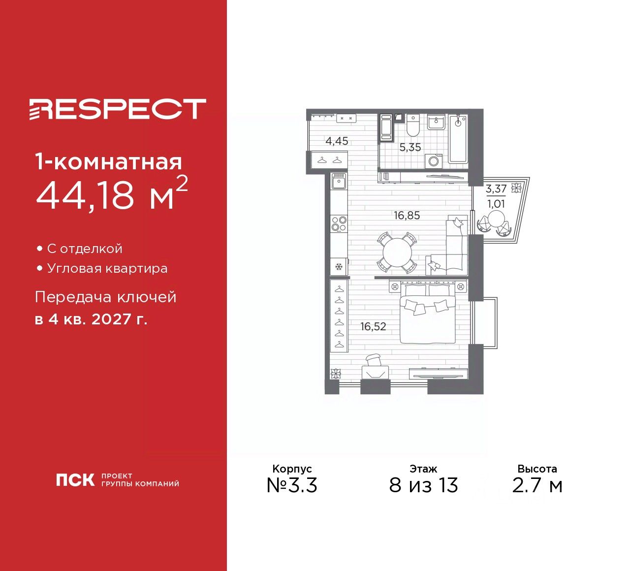 Однокомнатная квартира с отделкой в ЖК ''RESPECT'' на 8 этаже. Общая площадь: 44.18 кв.м., жилая: 16.52 кв.м., площадь просторной кухни-столовой: 16.85 кв.м. Угловая квартира, очень светлая, естественная вентиляция при открытии окон. В квартире один балкон, один совмещенный санузел. Высота потолков 2.7 м.