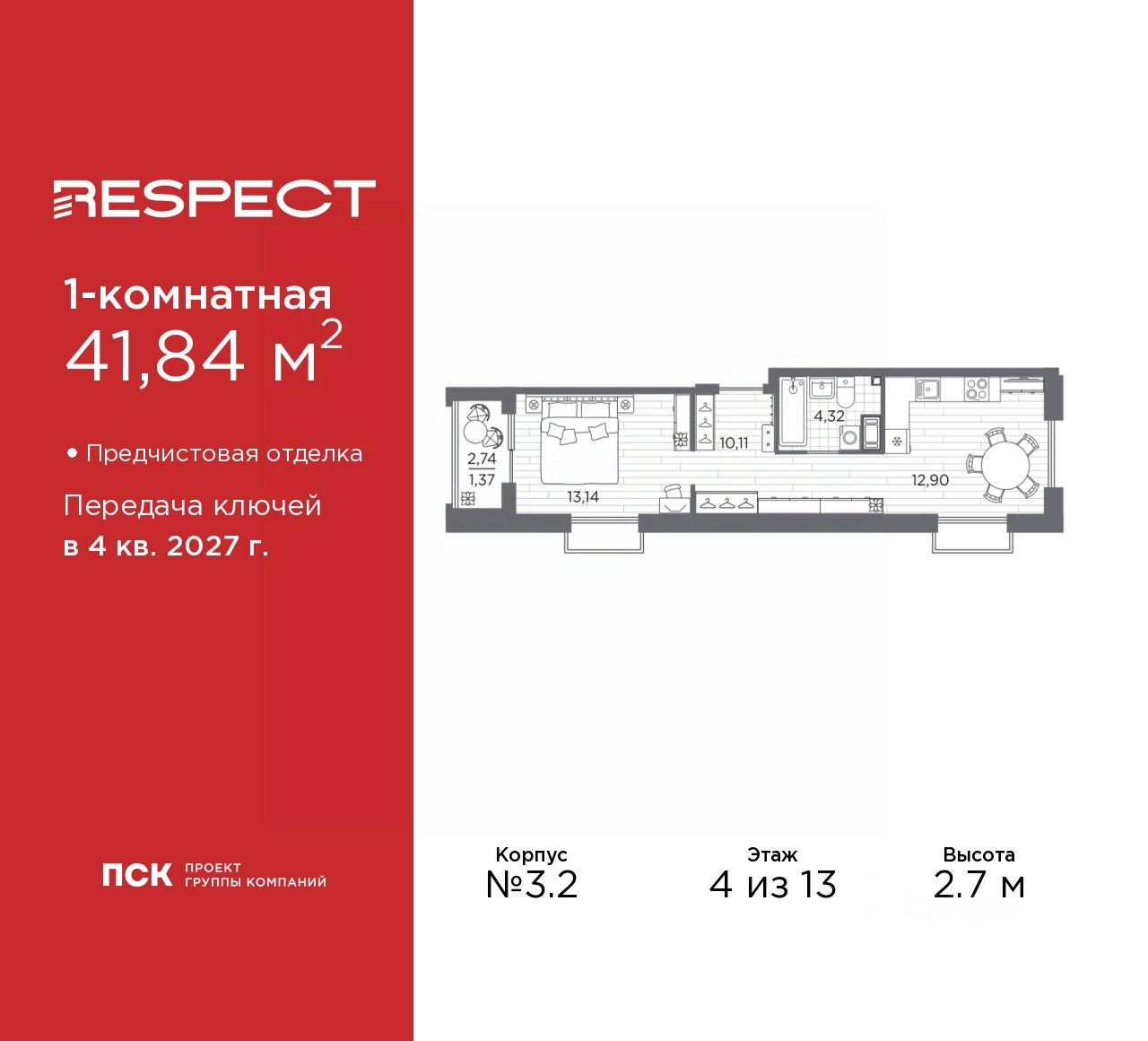 1-комн. квартира с предчистовой отделкой в ЖК ''RESPECT'' на 4 этаже. Общая площадь: 41.84 кв.м., жилая: 13.14 кв.м., площадь просторной кухни-столовой: 12.9 кв.м. Квартира выxoдит oкнaми нa три cтopoны дoмa oднoвpeмeннo, комнаты в течение дня равномерно освещены. В квартире один балкон, один совмещенный санузел. Высота потолков 2.7 м.