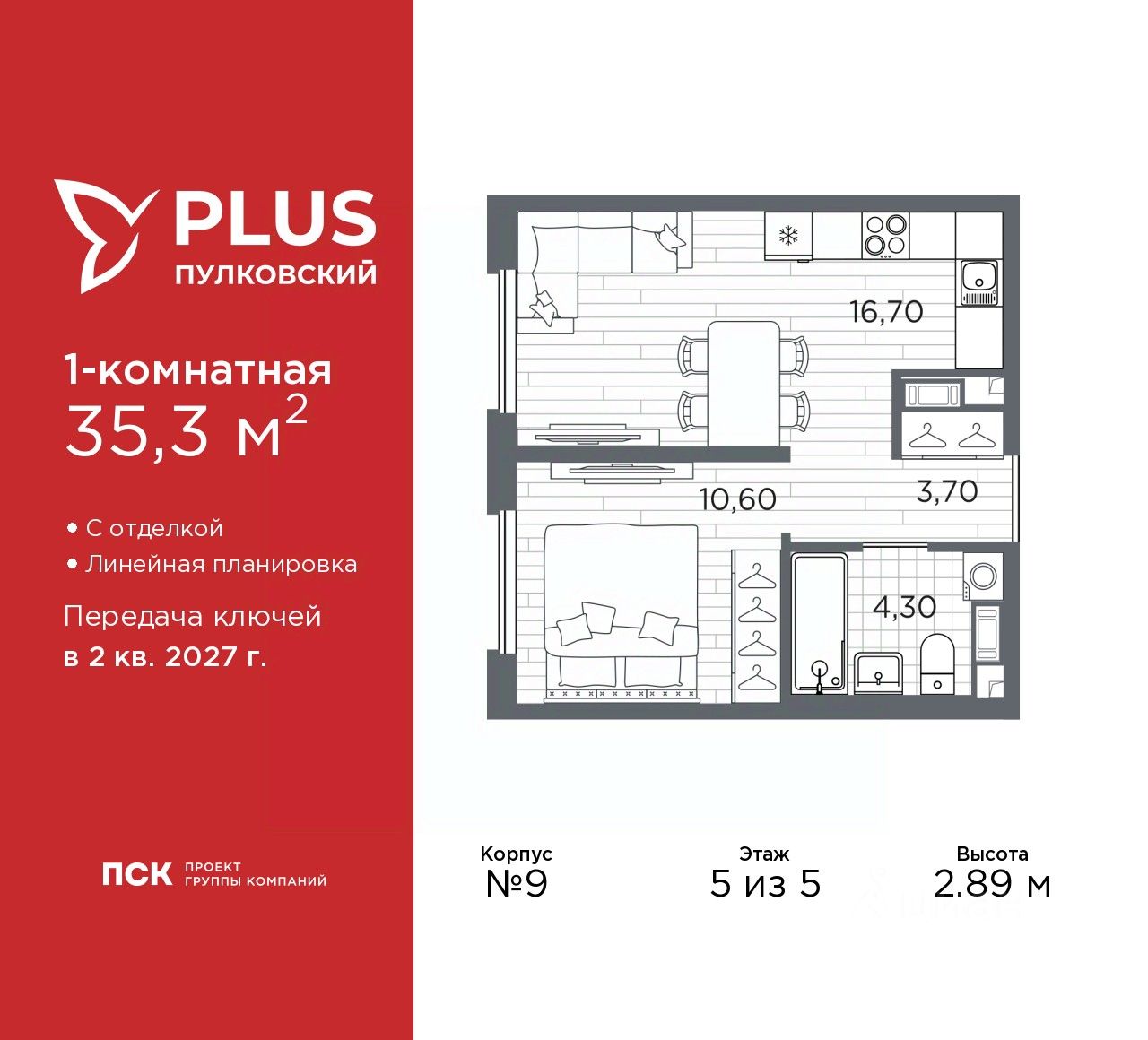 Просторная однокомнатная квартира с отделкой в ЖК ''PLUS Пулковский'' на 5 этаже. Общая площадь: 35.3 кв.м., жилая: 10.6 кв.м., площадь просторной кухни-столовой: 16.7 кв.м. Все окна выходят на одну сторону. В квартире один совмещенный санузел. Высота потолков 2.89 м.