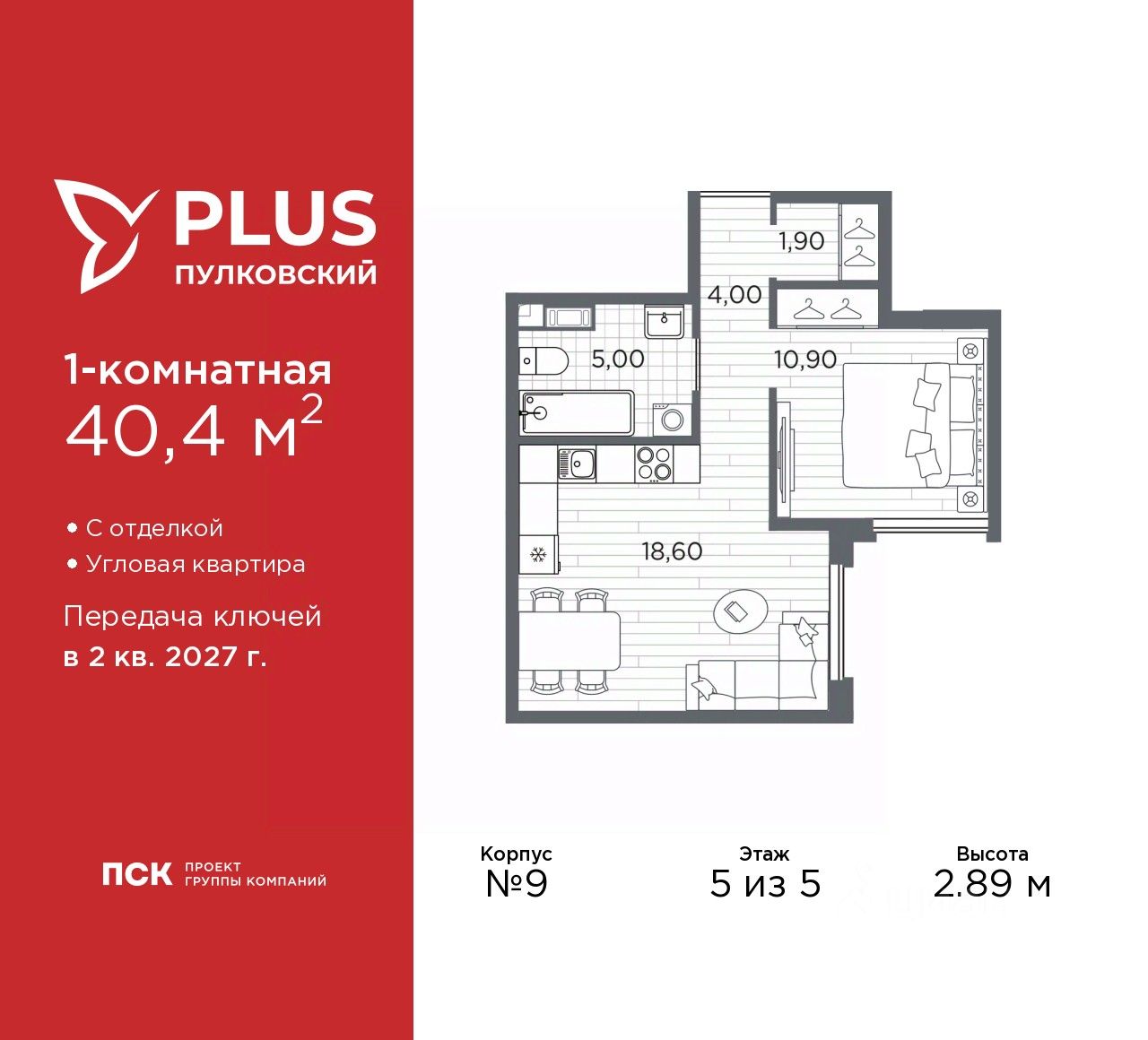Просторная 1-комн. квартира с отделкой в ЖК ''PLUS Пулковский'' на 5 этаже. Общая площадь: 40.4 кв.м., жилая: 10.9 кв.м., площадь просторной кухни-столовой: 18.6 кв.м. Угловая квартира, идеально подойдет любителям тишины и панорамных видов. В квартире один совмещенный санузел. Высота потолков 2.89 м.