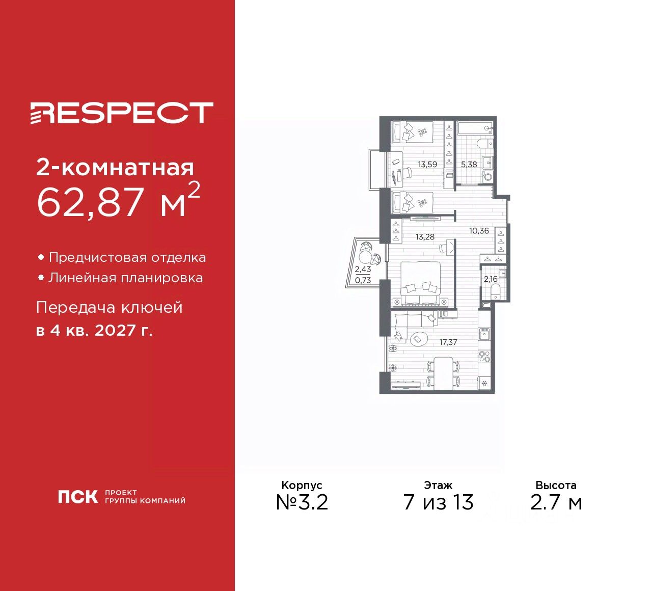 Продается двухкомнатная квартира с предчистовой отделкой в ЖК ''RESPECT'' на 7 этаже. Общая площадь: 62.87 кв.м., жилая: 26.87 кв.м., площадь просторной кухни-столовой: 17.37 кв.м. Комнаты изолированные, все окна выходят на одну сторону. В квартире один балкон, один совмещенный и один раздельный санузел. Высота потолков 2.7 м.