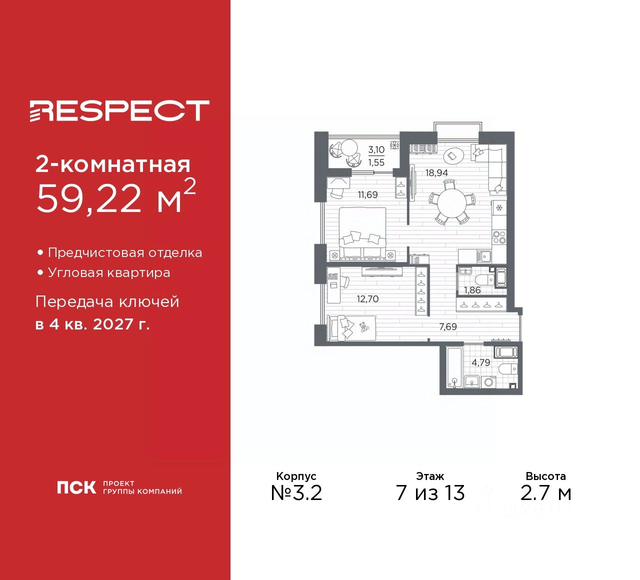 Двухкомнатная квартира с предчистовой отделкой в ЖК ''RESPECT'' на 7 этаже. Общая площадь: 59.22 кв.м., жилая: 24.39 кв.м., площадь просторной кухни-столовой: 18.94 кв.м. Угловая квартира, идеально подойдет любителям тишины и панорамных видов. В квартире одна лоджия, один совмещенный и один раздельный санузел. Высота потолков 2.7 м.