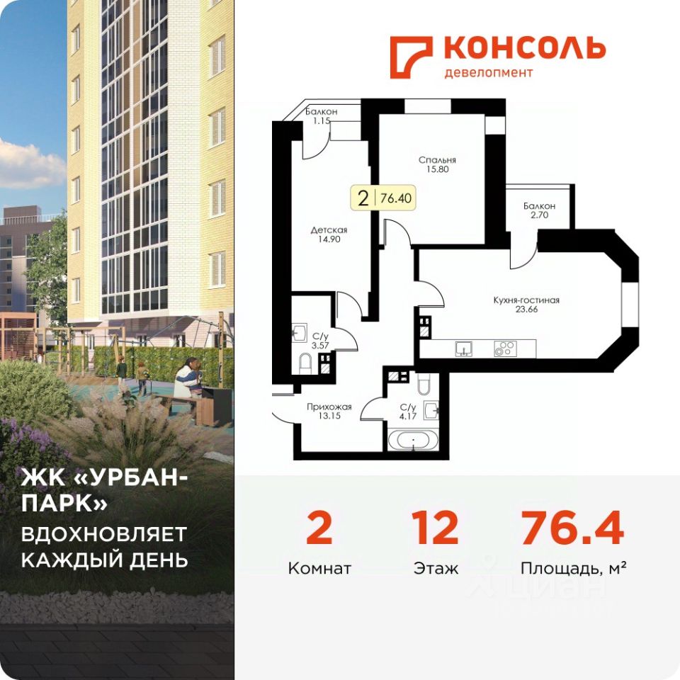 Продается двухкомнатная квартира 111 без отделки в ЖК ''Урбан Парк'' площадью 76.4 на 12 этаже от застройщика Консоль девелопмент.