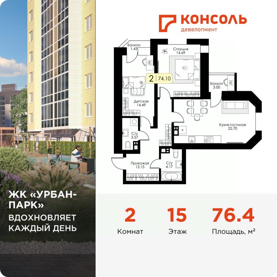 Продается двухкомнатная квартира 144 без отделки в ЖК ''Урбан Парк'' площадью 76.4 на 15 этаже от застройщика Консоль девелопмент.