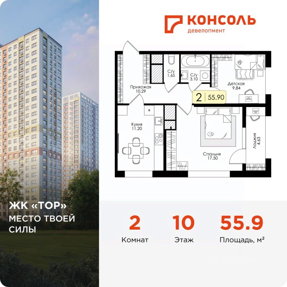 Продается двухкомнатная квартира 99 без отделки в ЖК ''ТОР'' площадью 55.9 на 10 этаже от застройщика Консоль девелопмент.