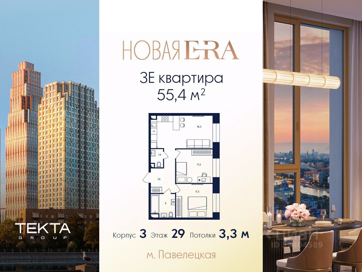 3-комн. квартира в ЖК ''Era'' на 29 этаже в 33 этажном здании Корпус 3. Общая площадь: 55.4 кв.м., жилая: 33.80 кв.м. Высота потолков 3.30 м.