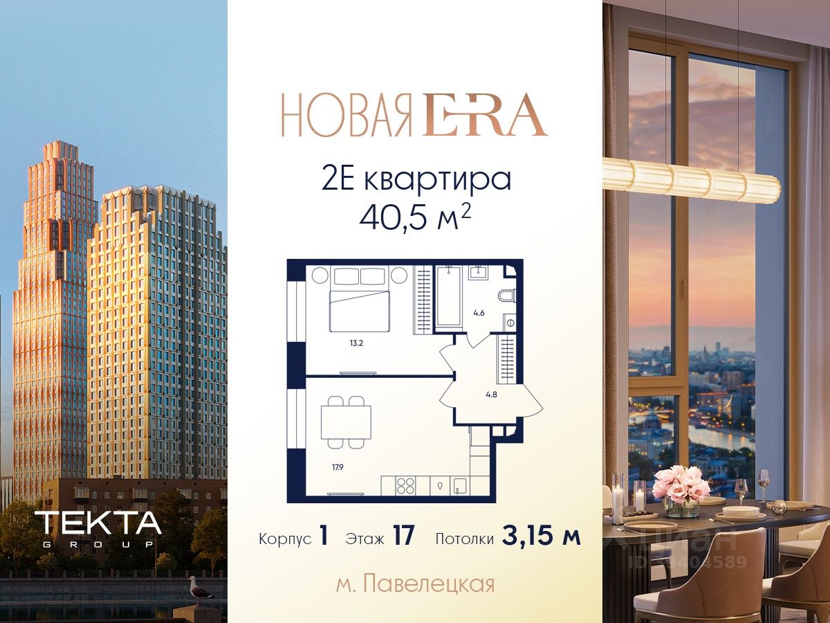 2-комн. квартира в ЖК ''Era'' на 17 этаже в 27 этажном здании Корпус 1. Общая площадь: 40.5 кв.м., жилая: 25.50 кв.м. Высота потолков 3.15 м.