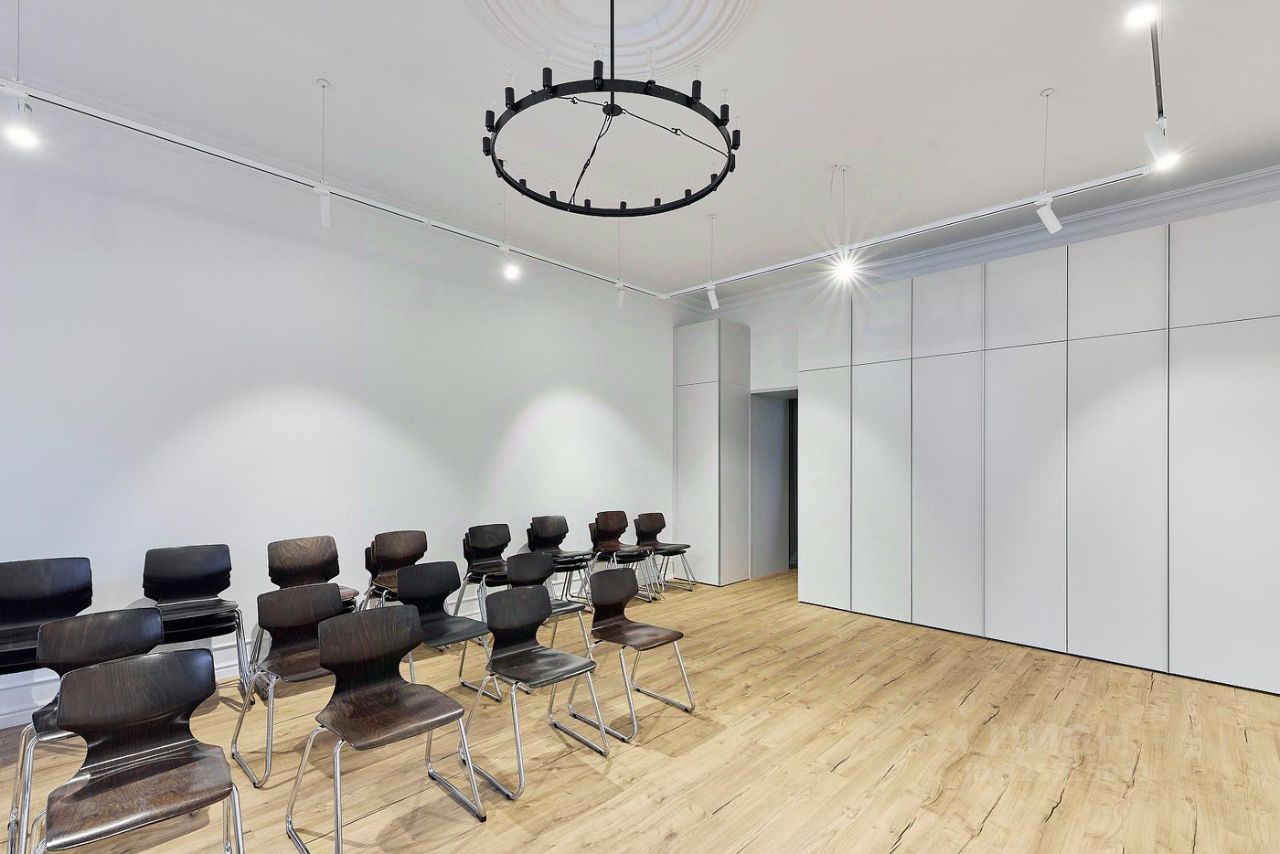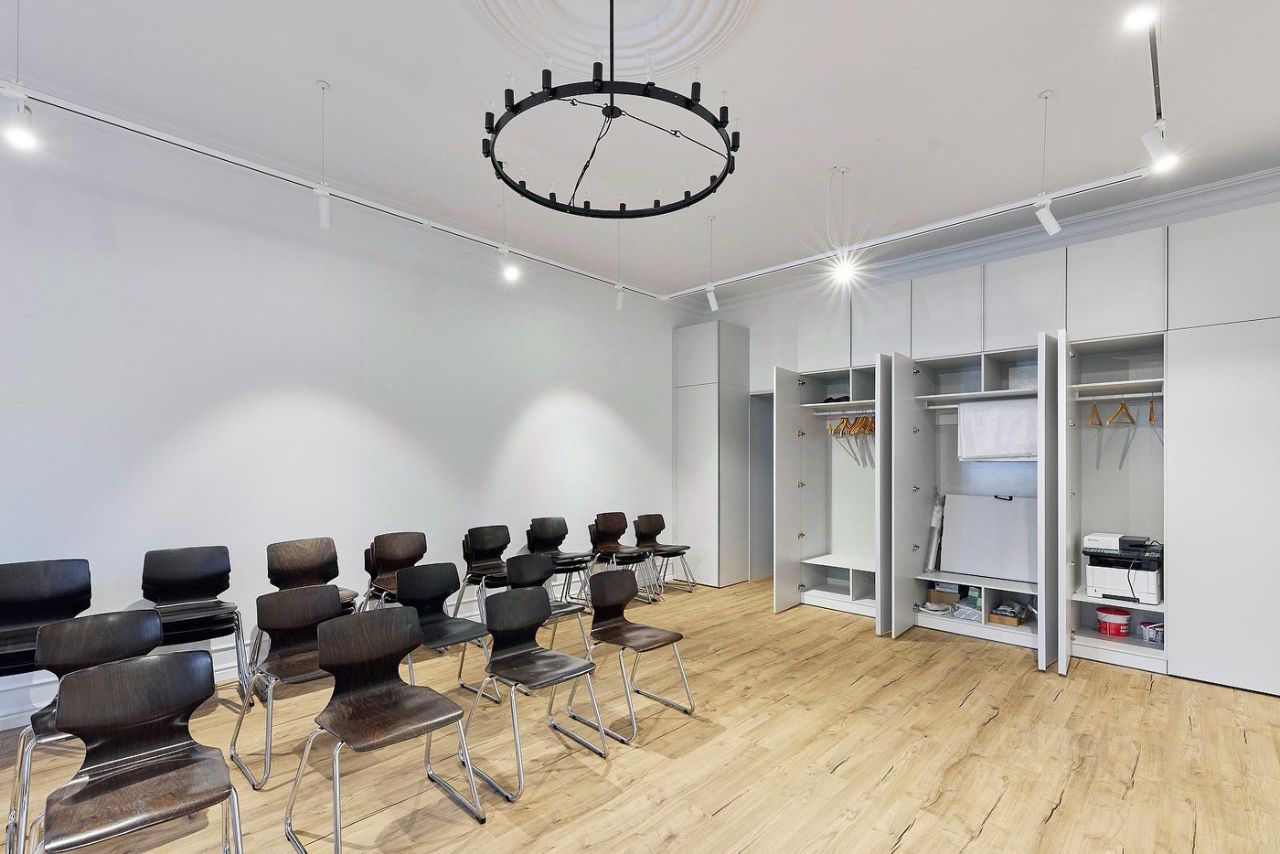 Планировка • два кабинета, • большой трансформируемый зал (рабочие зоны, лекции, сессии, вечерние форматы), • розетки в полу и у окон — свободная расстановка мебели и техники.