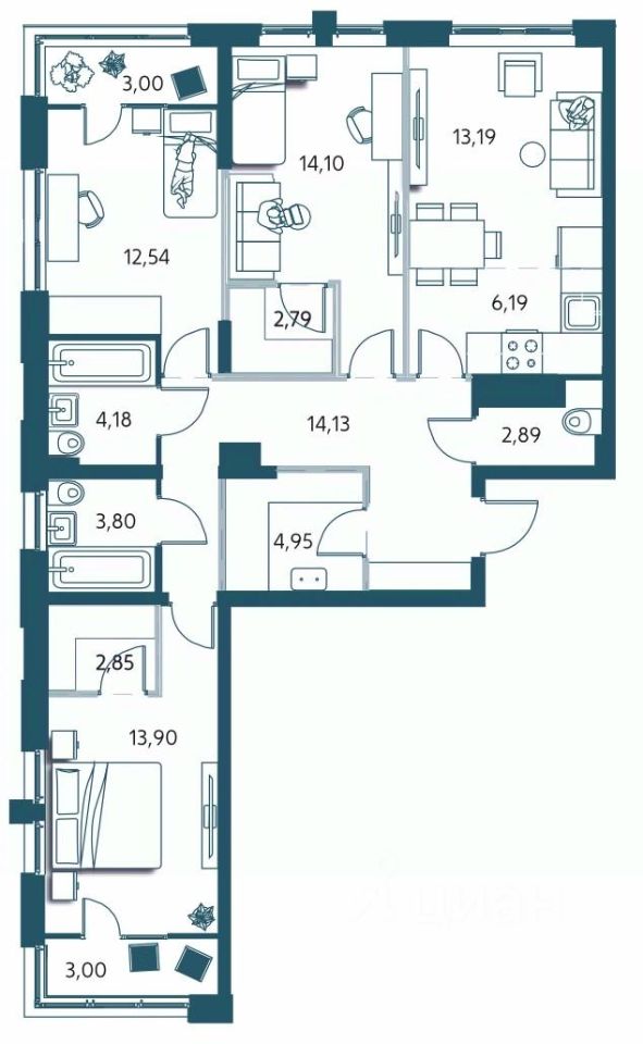 О КВАРТИРЕ 4-комн. квартира с рациональной планировкой площадью 101,51 м2. При входе Вы сразу же попадете в большую гардеробную зону. Далее Вас встречают большая кухня-гостиная 19,4м2. Три изолированные спальни (12,54м2 + 14,1м2 + 13,9м2), что обеспечивает приватность для всех членов семьи. В двух комнатах есть просторные гардеробные. Три санузла. Планировка на 2 стороны света! Такая планировка повышает комфорт, способствует хорошему климату внутри жилья и предлагает больше возможностей для светлой и уютной организации пространства.