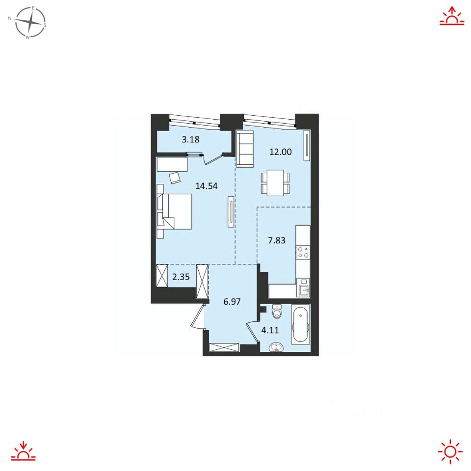 О КВАРТИРЕ Площадь 51м2 Функциональная планировка, которая обеспечивает комфортное использование пространства. Изолированная комната площадью 14,54м2 с выходом на балкон. Просторная кухня-гостиная 19,83м2. В прихожей предусмотрена ниша для встроенной мебели. Качественная предчистовая отделка.