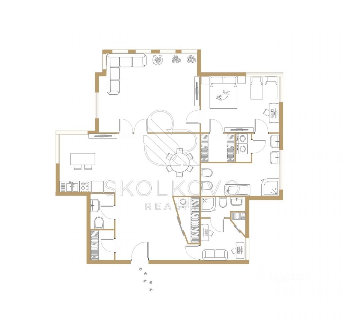Современное планировочное решение: открытая кухня, объединенная с гостиной и столовой, изолированные спальни, а также две ванные комнаты, оборудованные по последнему слову техники. Полная меблировка: квартира реализуется с мебелью и техникой от ведущих мировых производителей.