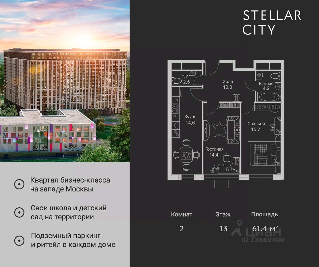 Квартира находится на 13 этаже, 4 корпуса жилого квартала Stellar City — микрогорода будущего на орбите Москвы.