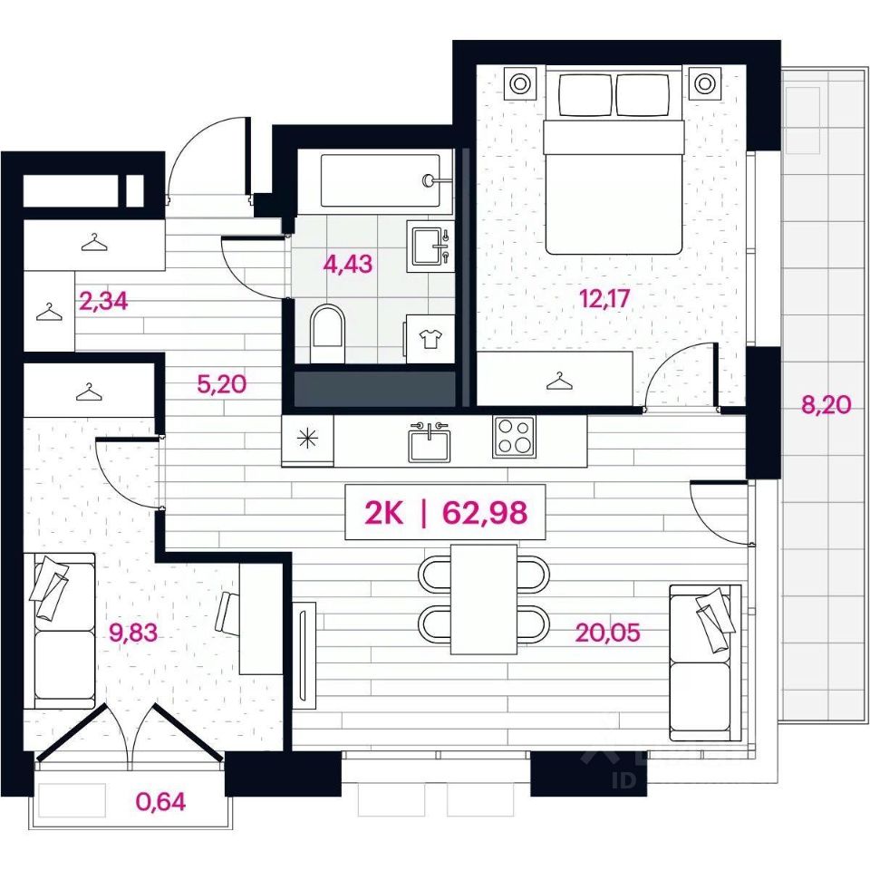 Общая площадь62,98 м2