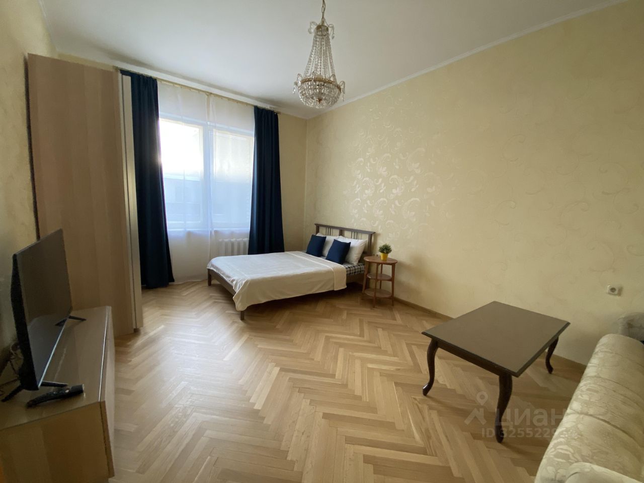 Комната визуально поделена на две зоны: спальную и гостиную.
