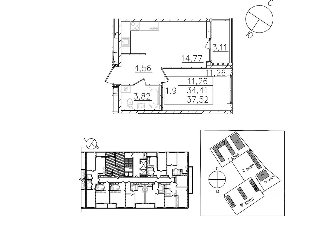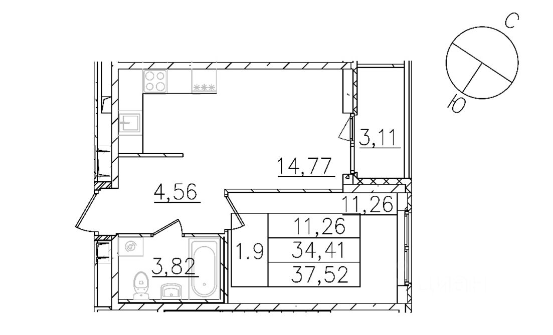 Кухня-гостиная 14.77м., Спальня 11.26м.