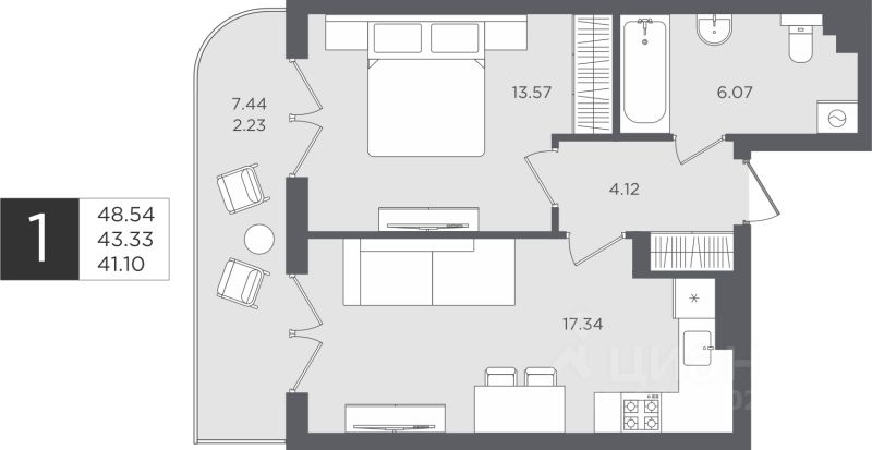 Общая площадь43,33 м2