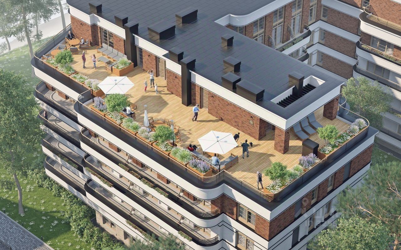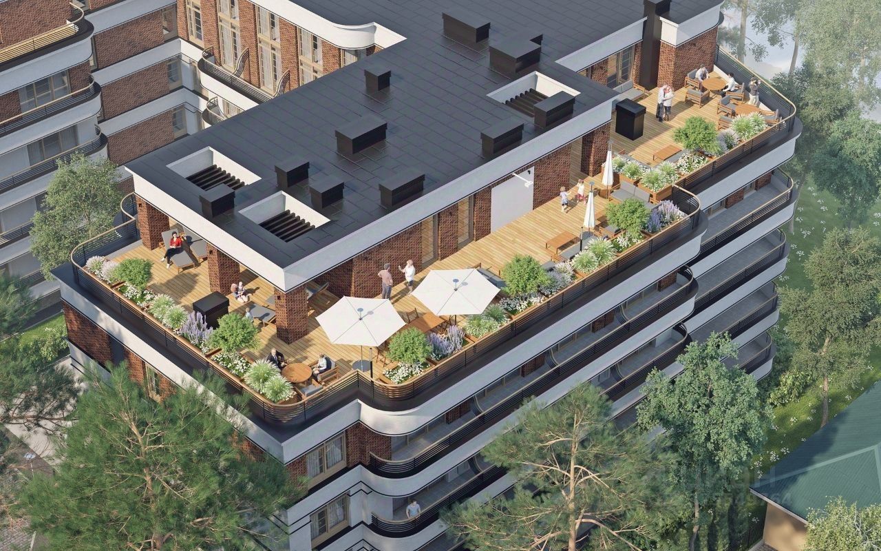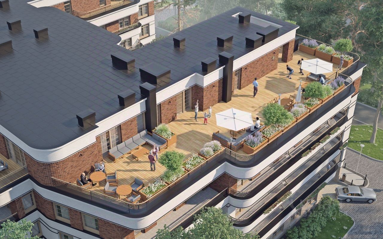 Преимущества: - Фонтан в центре двора. - Эксплуатируемая кровля с видом на Балтийское море. - Пространство для отдыха с лежаками, озеленением, зоной барбекю, открытым кинотеатром. - Индивидуальный дизайн-проект мест общего пользования. - Входные двери высокого класса безопасности. - Кладовые помещения.