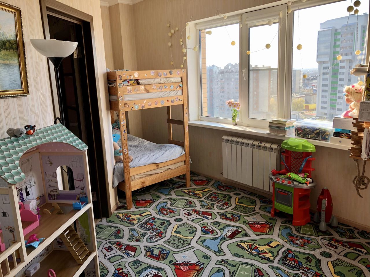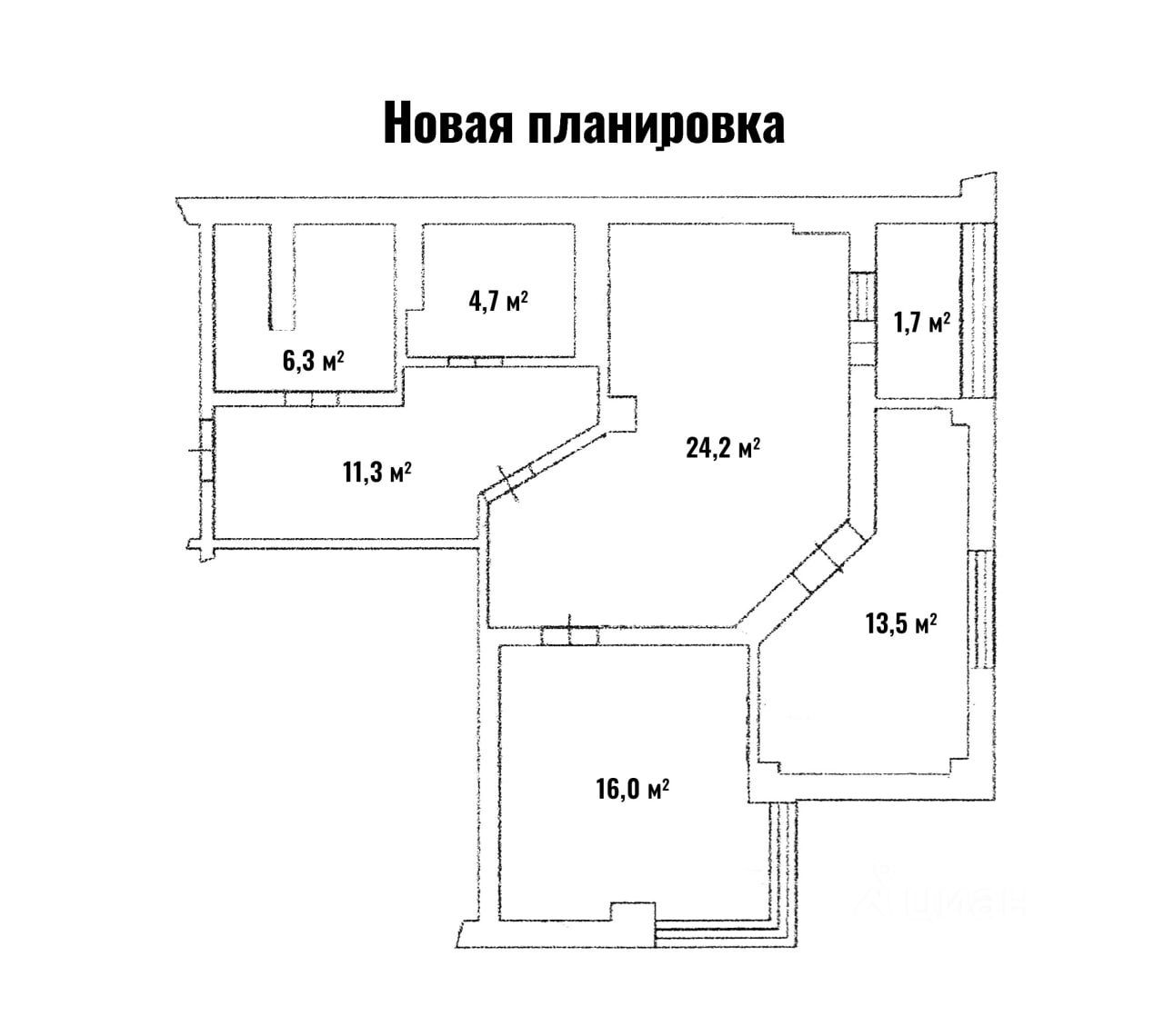 Узаконенная перепланировка (делали для своей семьи с двумя детьми, чтобы получить две изолированные спальни и просторную общую зону кухня-столовая-гостиная), площади получившихся помещений: - кухня-гостиная 24,2 м2 - спальня 16 м2 - детская 13,5 м2 - совмещенный санузел 4,7 м2 - оборудованная кладовая-гардеробная 6,3 м2 - коридор 11,3 м2 со шкафами-купе - застекленная лоджия 1,7 м2
