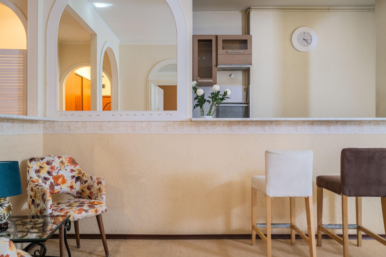 -В квартире 4 спальных места: двухспальная кровать (160х200) и диван-кровать (140х200), ЖК-телевизор, -Полностью оборудованный кухонный гарнитур с электрическим чайником, микроволновой печью и всей необходимой посудой, обеденный стол и стулья, -Санузел с ванной и туалетом. Также есть утюг, фен и стиральная машинка.
