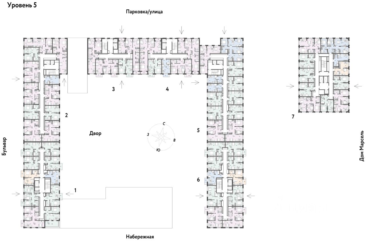 Разнообразие планировок: от классических до квартир с мастер-спальней и террасами. Подземный паркинг с кладовыми, охраной и видеонаблюдением 24/7. Ремонт от застройщика: 5 вариантов на выбор. Закрытый двор с площадками и зонами отдыха: мост-акведук, тренажёры, лабиринты, гамаки и шезлонги.