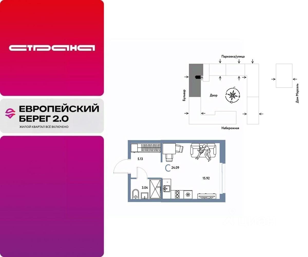 Продается 1комнатная квартира на 14 этаже от застройщика Страна Девелопмент. Площадь квартиры 24,09 кв. м.