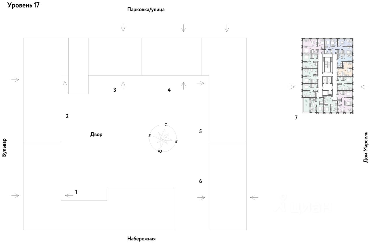 Разнообразие планировок: от классических до квартир с мастер-спальней и террасами. Подземный паркинг с кладовыми, охраной и видеонаблюдением 24/7. Ремонт от застройщика: 5 вариантов на выбор. Закрытый двор с площадками и зонами отдыха: мост-акведук, тренажёры, лабиринты, гамаки и шезлонги.