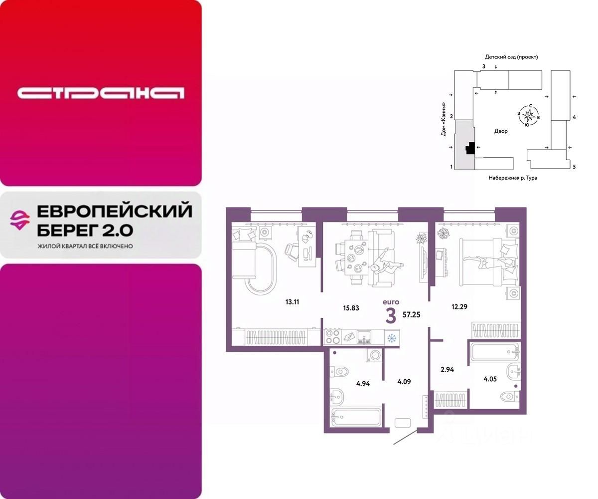Продается 3комнатная квартира в новом ЖК ''Европейский берег''. Общая площадь квартиры 57,25 кв. м. Сдача — в 4 квартале 2025 года.