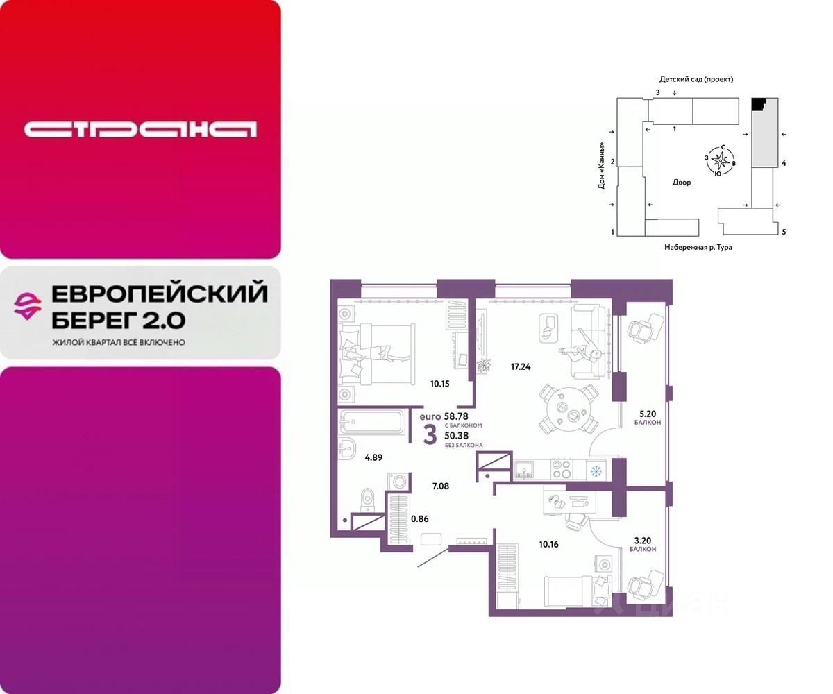Продается 3комнатная квартира в новом ЖК ''Европейский берег''. Общая площадь квартиры 58,78 кв. м. Сдача — в 4 квартале 2025 года.