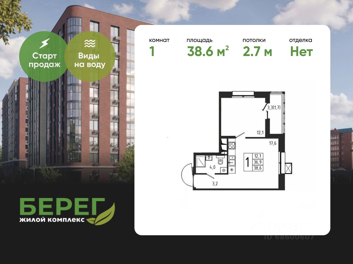 Продаётся 1-комнатная квартира в строящемся доме (Корпус 8 (2 очередь)), общей площадью 38.60 кв.м., на 4 этаже.