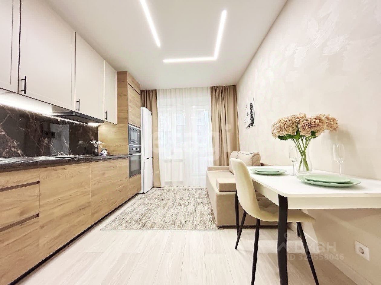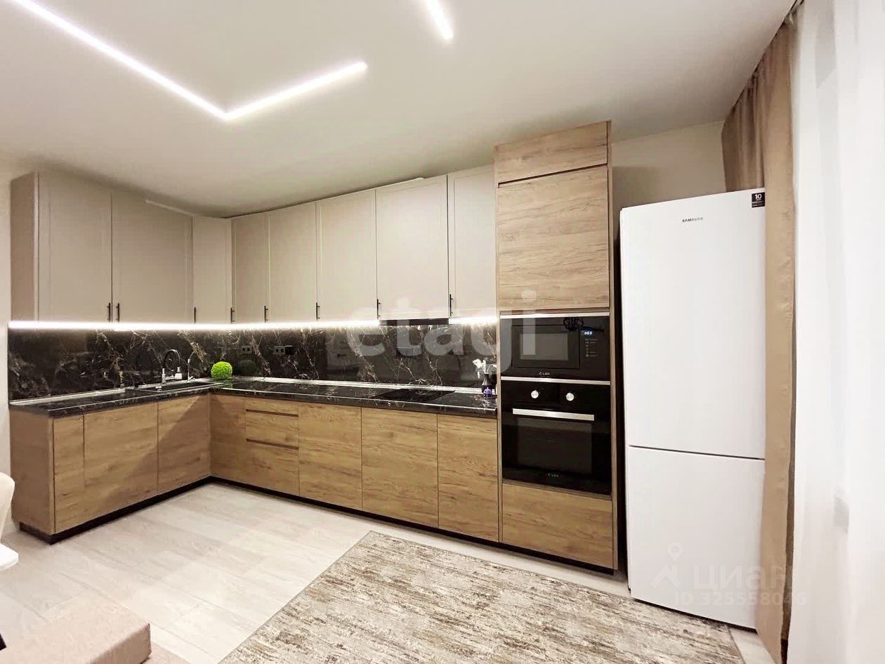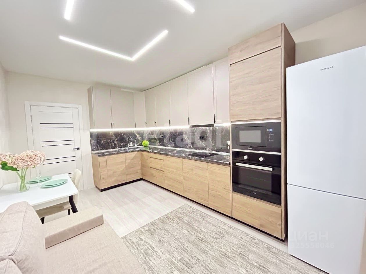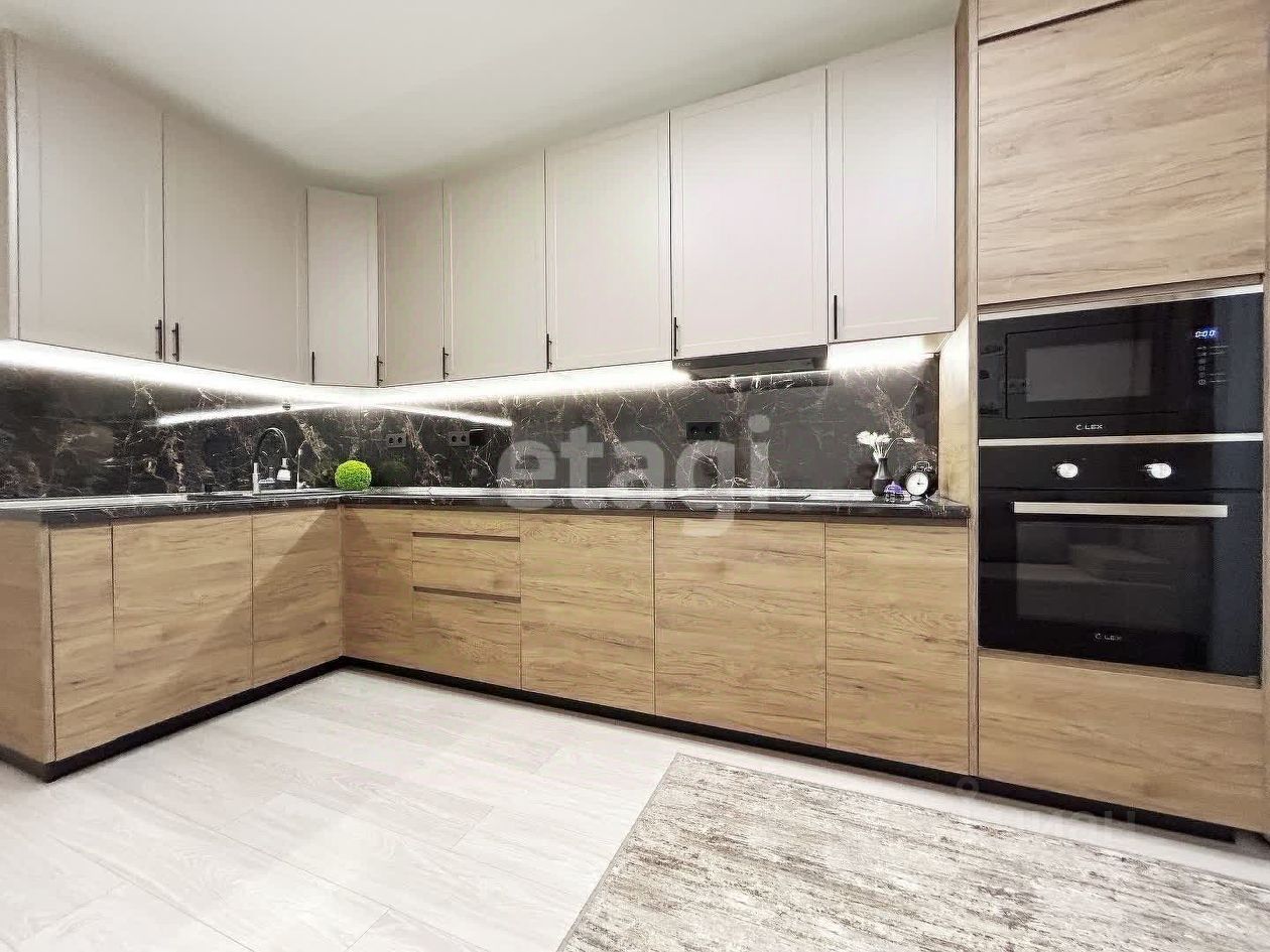 Просторная кухня-гостиная со встроенной техникой, обеденной зоной и зоной отдыха.