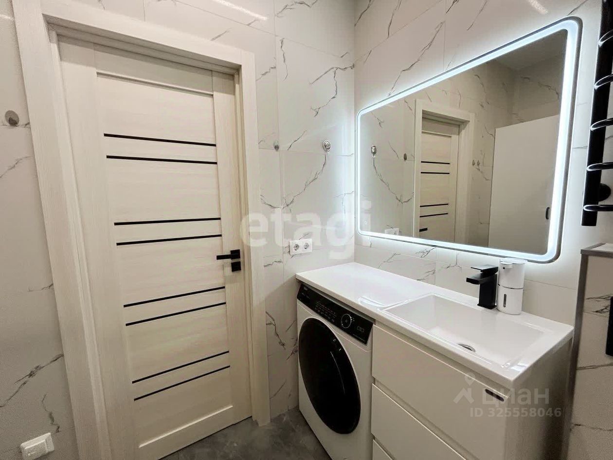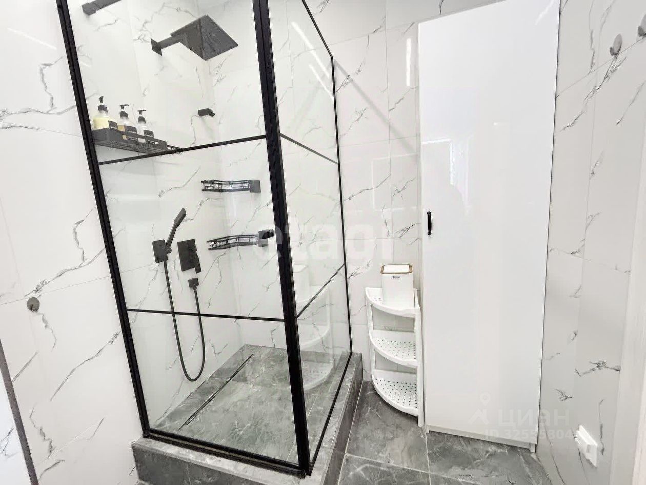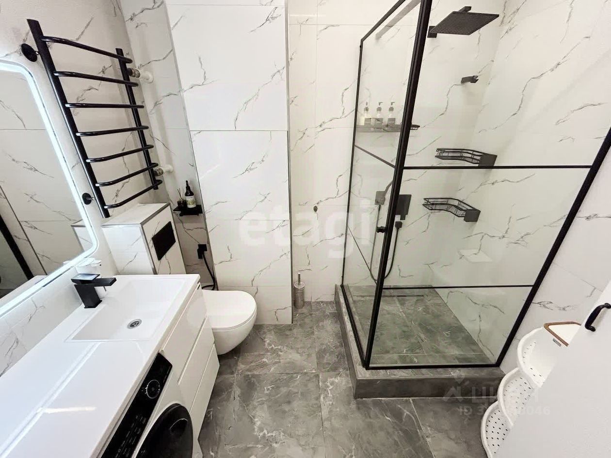 Совмещенный санузел с душевой, стиральной машиной и местами для хранения.