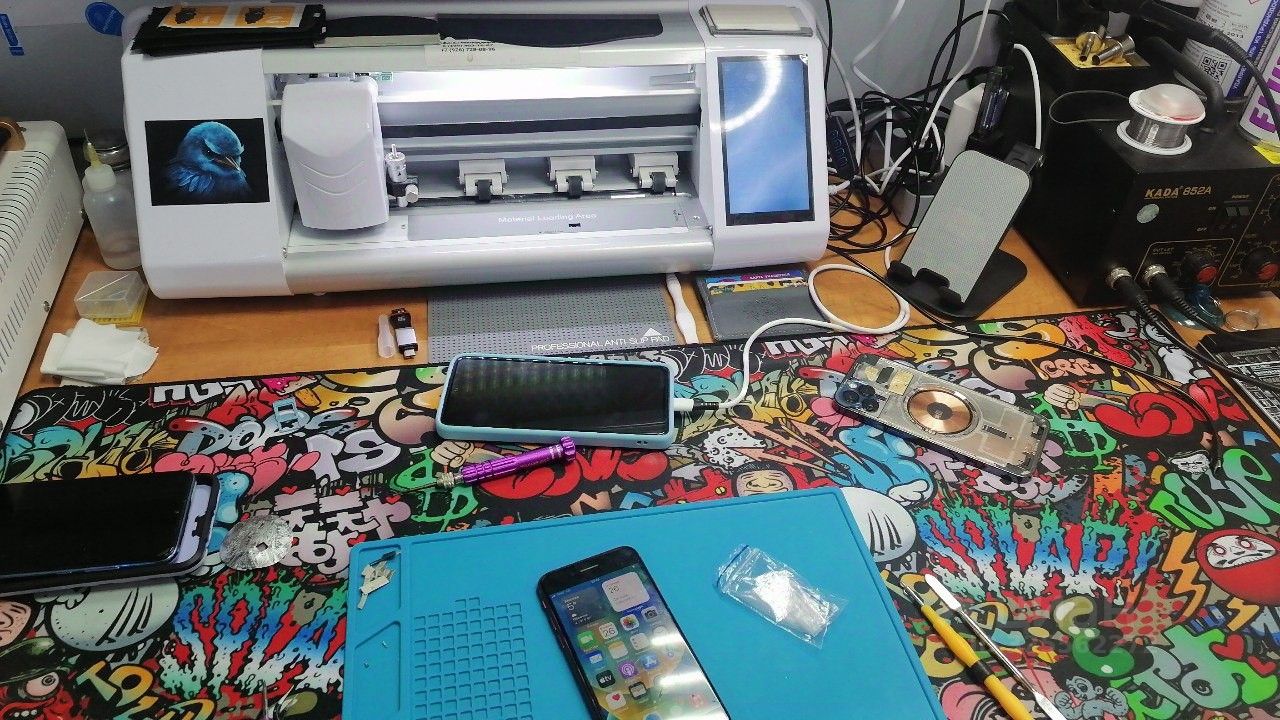 Оборудование: Компьютер, принтер ч/б, принтер цветной с СНПЧ (Epson l800), ламинатор, плоттер для резки пленок на любые мобильные устройства, сепаратор, паяльная станция, фен, бегущая строка, проф. фотоаппарат, стойка, лампа