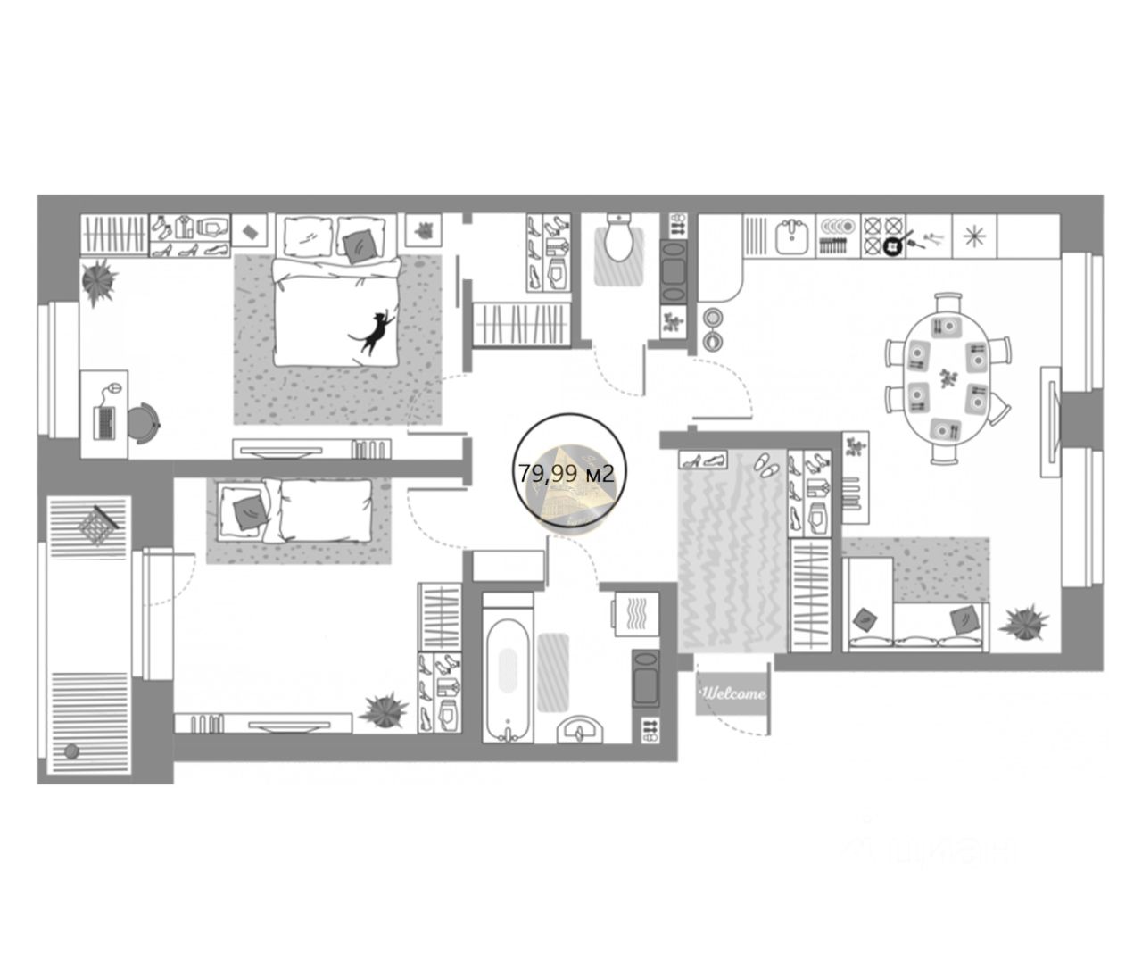 О квартире: - Квартира находится на 6 этаже 8-этажного дома - Общая площадь квартиры 79,99 м2 - Светлая спальня 15,83 м2 с гардеробной 2,14 м2 - Детская комната 12,78 м2 - Просторная кухня-гостиная 21,28 м2 - Раздельный санузел 3,90 м2 + 1,84 м2 - Лоджия 1,70 м2