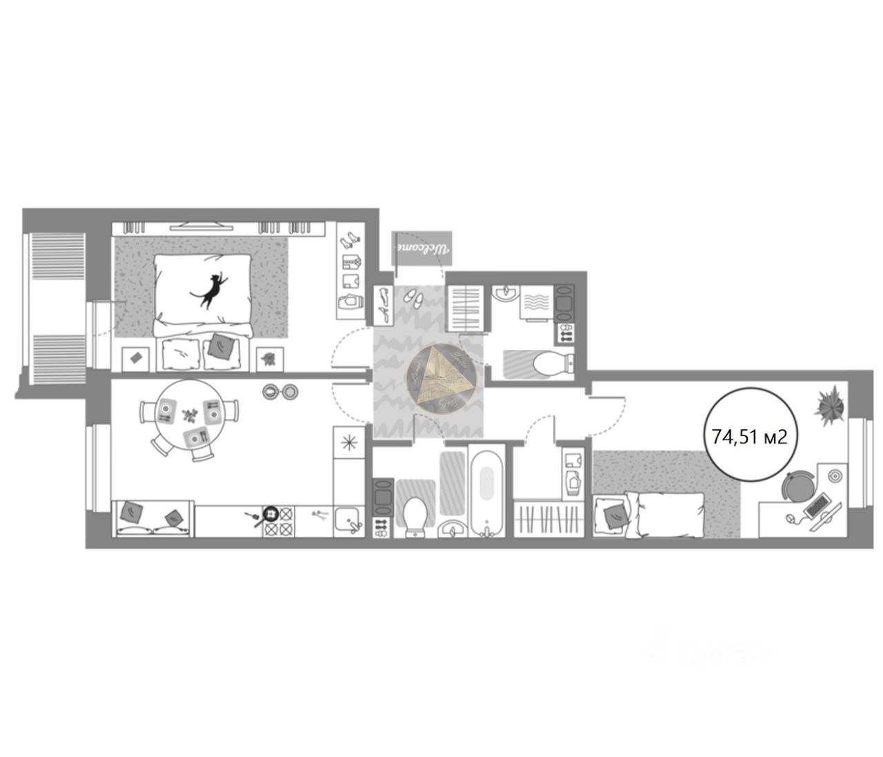 О квартире: - Квартира находится на 8 этаже 12-этажного дома - Общая площадь квартиры 74,51 м2 - Светлая спальня 15,28 м2 - Детская комната 15,92 м2 - Просторная кухня-гостиная 16,09 м2 - Раздельный санузел 4,26 м2 + 2,66 м2 - Гардеробная комната 2,70 м2 - Лоджия 1,73 м2