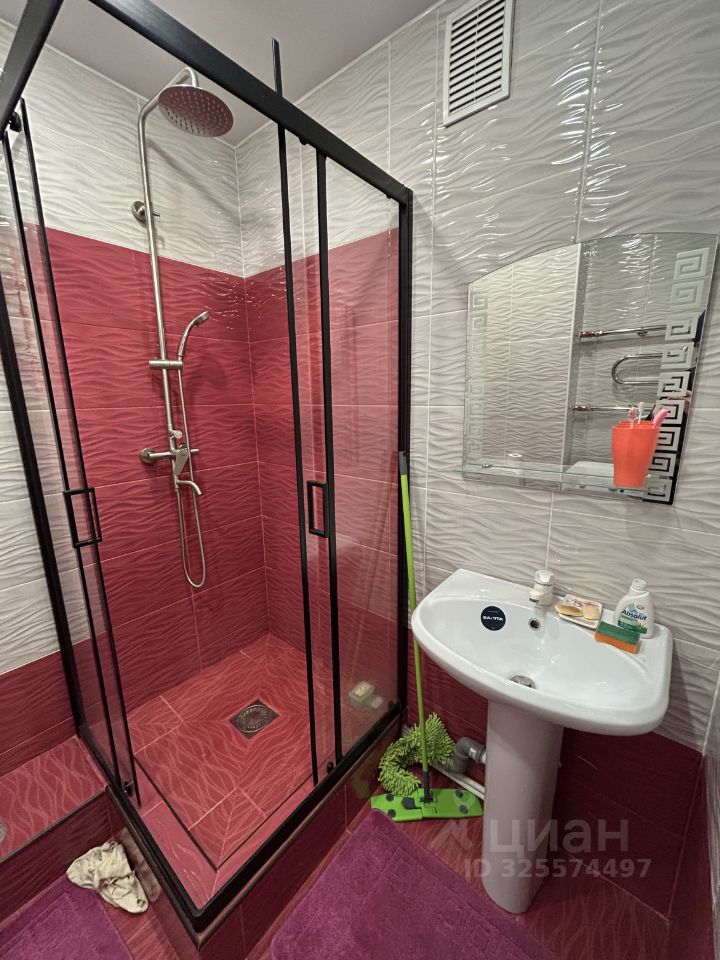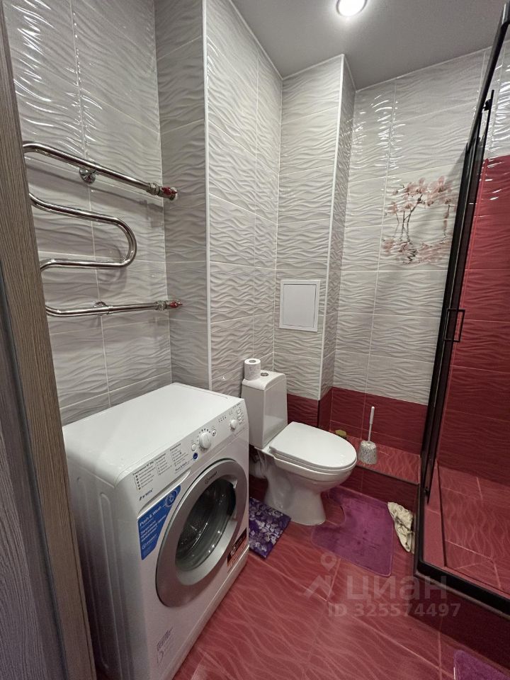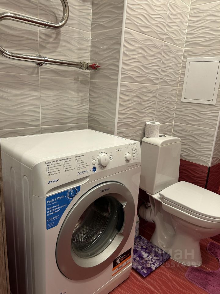 Ванная комната совмещена и оснащена современной душевой кабиной и стиральной машиной. Из окон открывается приятный вид на городскую застройку. Балкон застеклён