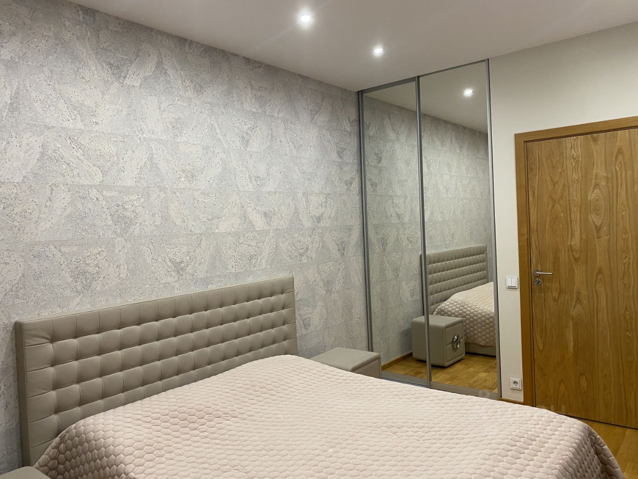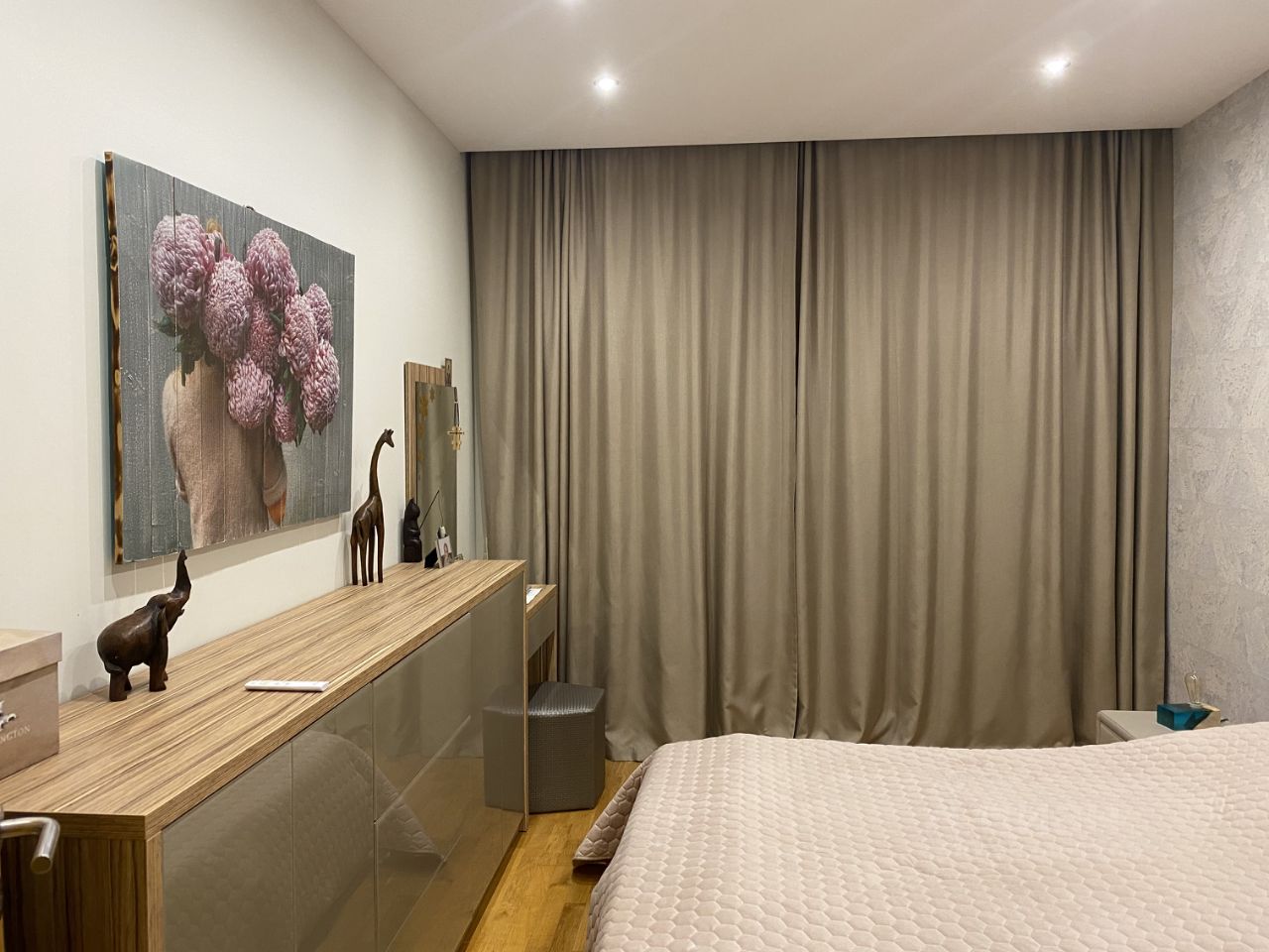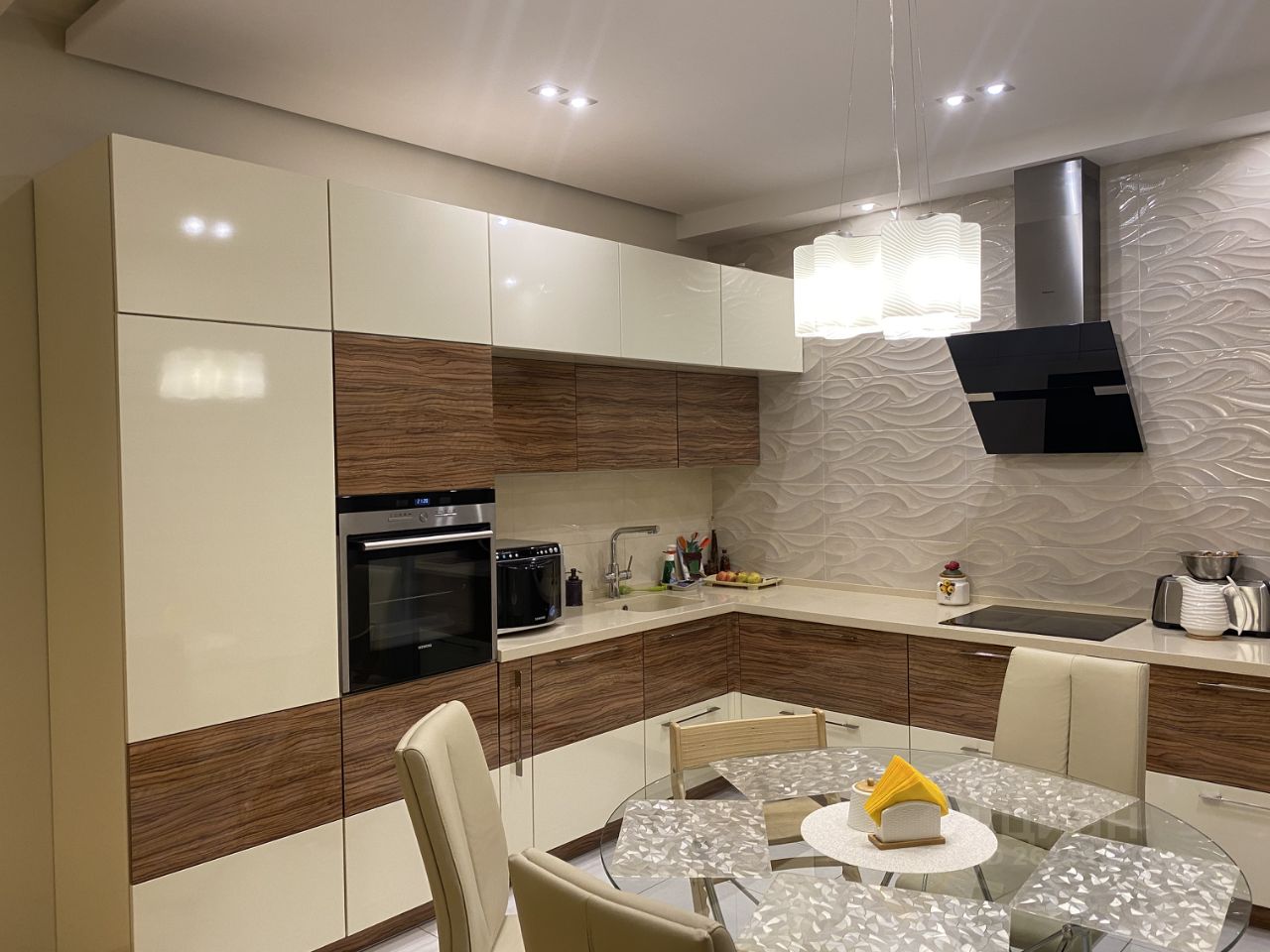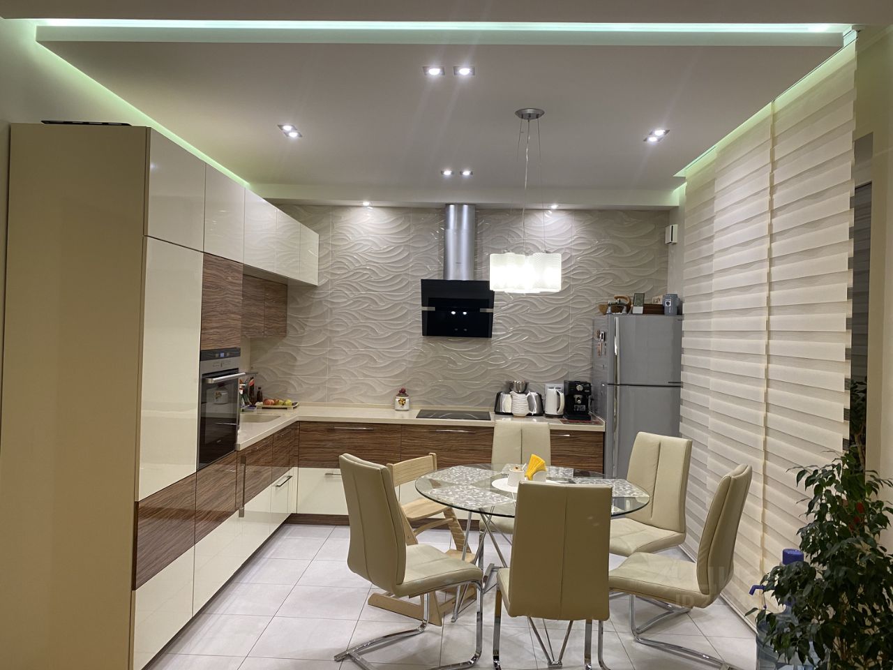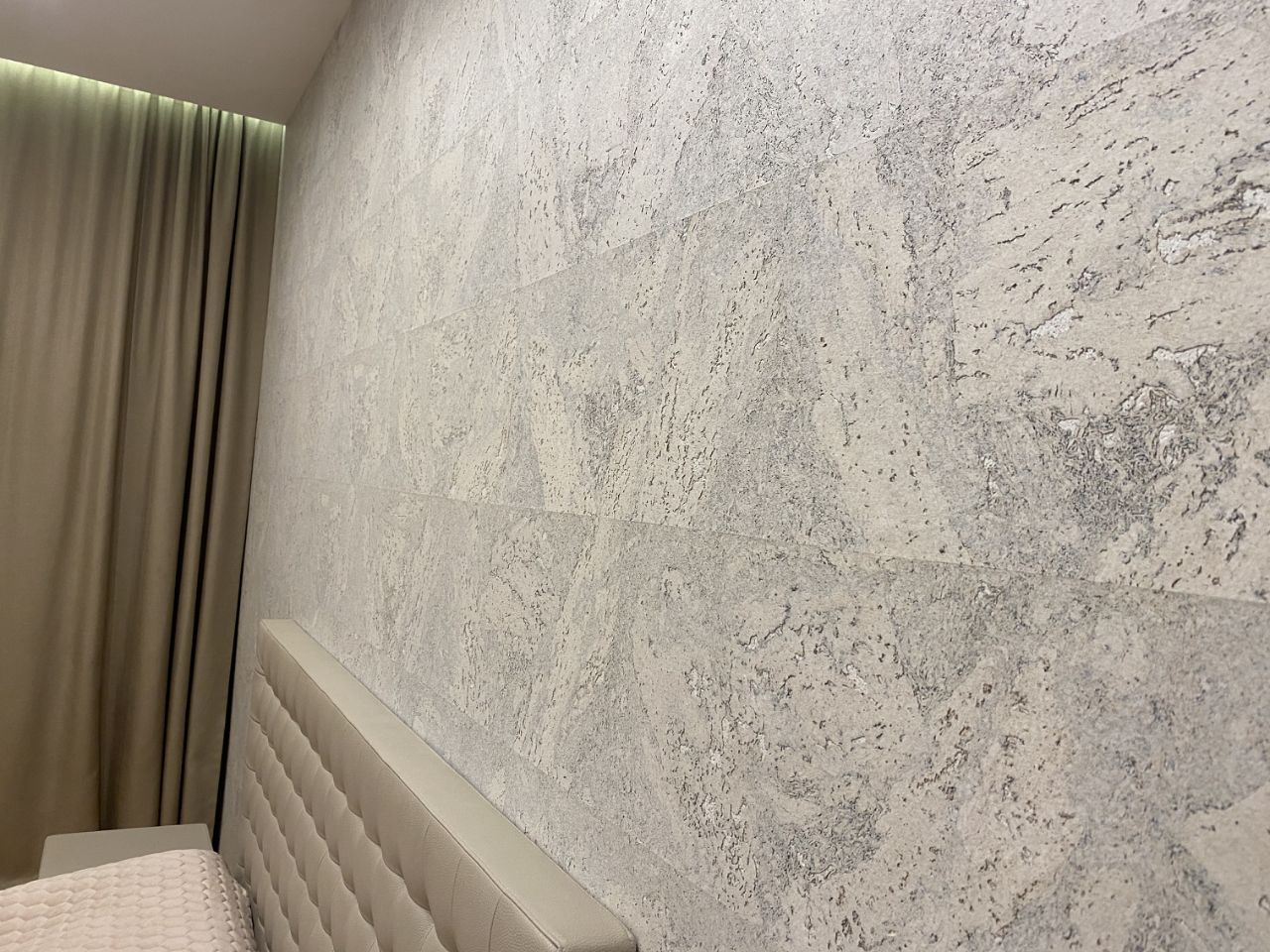 Вся мебель известных производителей: гостиная Bobox, спальня Estetica, детская Atica, кухня каменная столешница + фасады МДФ + фурнитура Blum. Парящий потолок в гостиной (освещение тёплое, на фото искажено) и в спальне + на стене натуральное покрытие из пробки.