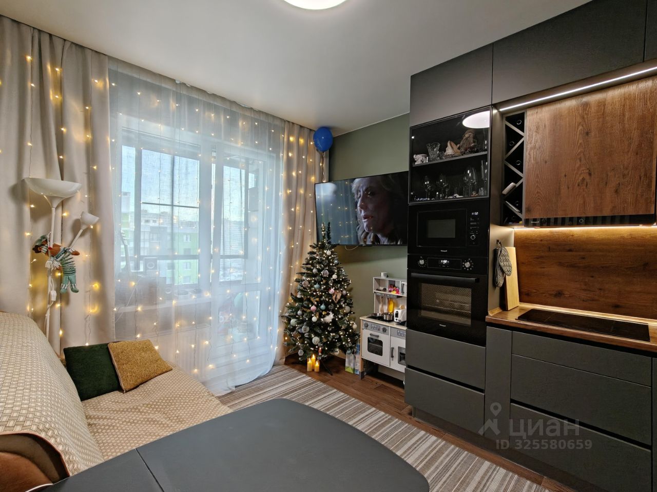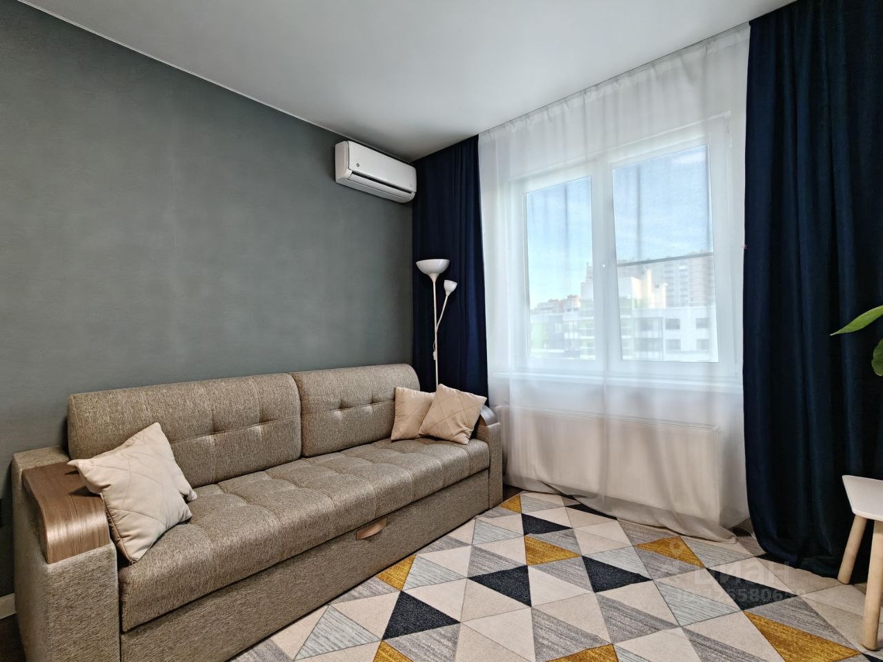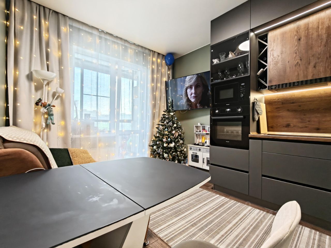 Новым жильцам остается: кухный гарнитур с варочной панелью и вытяжкой, встpoeнный шкaф-купе в комнате, встроенный шкаф и тумба с раковиной в ванной, кондиционер.