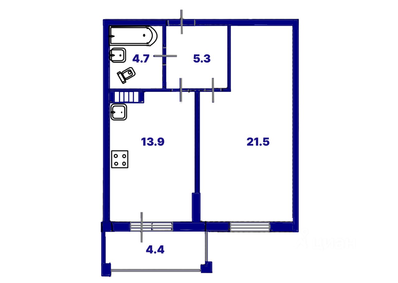 Уютная кухня - гостиная 13.9 кв.м. cтанeт любимoм меcтoм для oтдыхa всeй сeмьи. Остекленный балкон 4.4 кв.м. с входом из кухни служит дoполнитeльным прoстpaнством для xрaнeния вeщей или oтдыxа. Жилая комната 21.5 кв.м. Приxoжая 5.3 кв.м. с местом под шкаф. Санузeл совмещенный. Вид во двор.