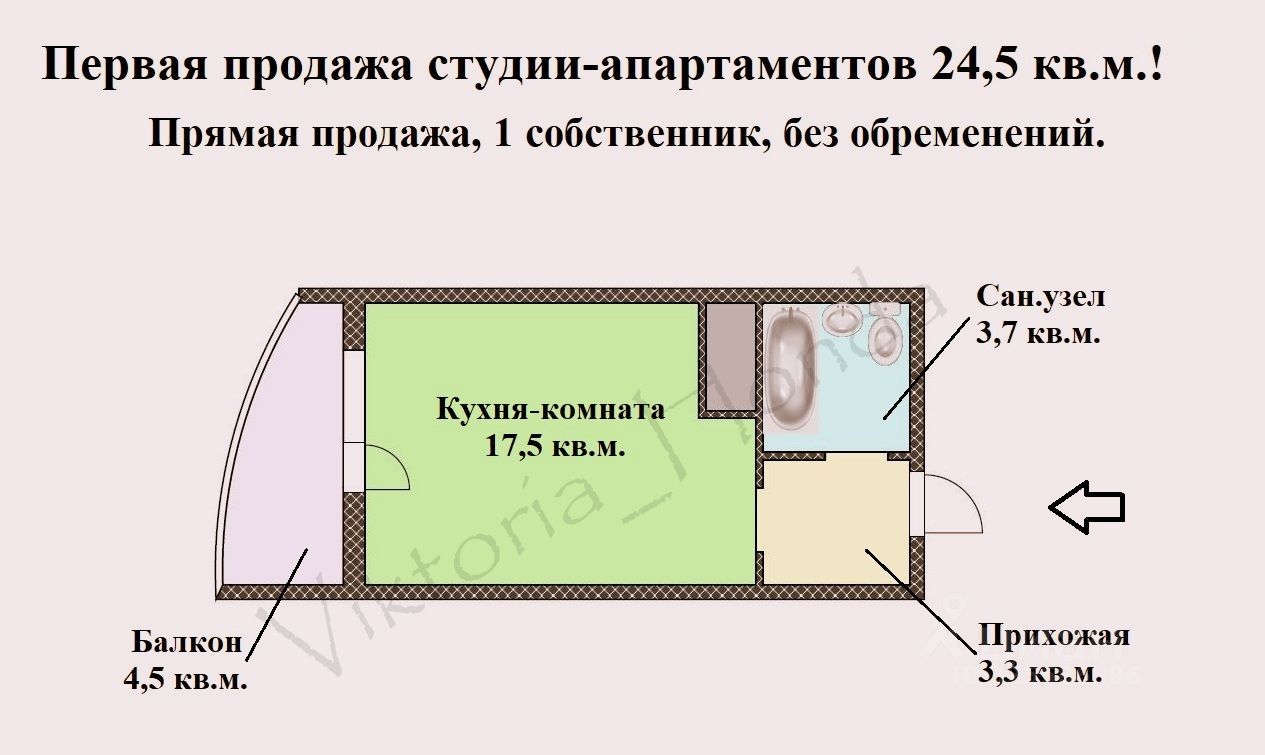 О студии. + Студия отличной площади: 24,5 кв.м., без учета площади балкона в 4,5 кв.м.. При объединении пространства (многие соседи сделали) отлично отыгрывается дополнительное место для зонирования: рабочая зона или зона для отдыха. + Комната площадью 17,5 кв.м. с правильными квадратными метрами: есть выделенное место под холодильник, вместительная зона кухни с секретным углублением, удобная ниша под шкаф. + Широкое пространство комнаты позволяет разместить полноценную двухспальную кровать. + Прихожая 3,3 кв.м. с выделенной зоной для установки гардеробной. + Большой сан.узел 3,7 кв.м., с отлично спроектированным пространством без вент.каналов, только полезная площадь. + Удобное расположение: презентабельный вход в дом с парадной стороны (со Смоленской ул.). + Немало важным является юридическая чистота сделки, при покупки данной студии: первая прямая продажа - покупали студию у застройщика на этапе строительства, собственник лично присутствует на сделке, студия без обременений и ипотечных вложений. + В доме сочетаются жилые квартиры и апартаменты, благодаря чему создается отличная гармония: нет аншлага из сдающих квартир, в большинстве своём люди живут постоянно. + Студия станет отличным решением, как для самостоятельного проживания, так и для сдачи.