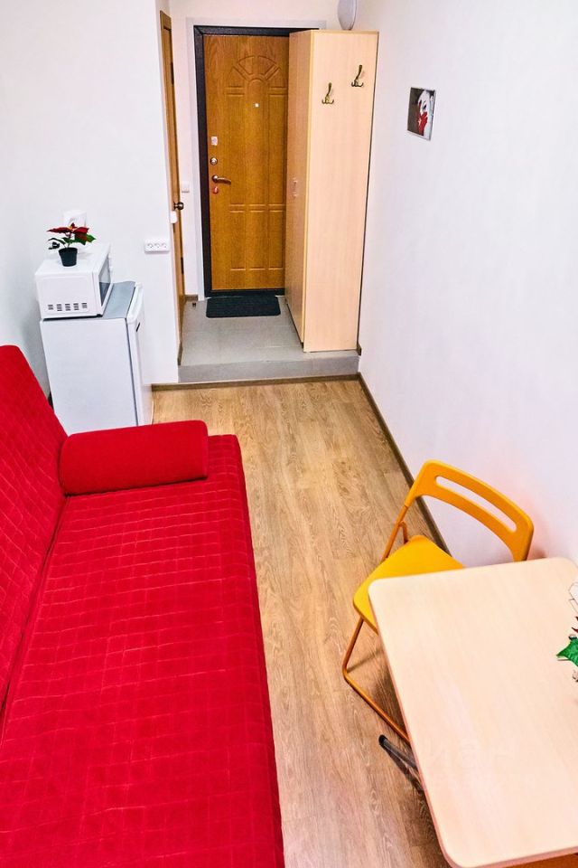 Все необходимое есть: Диван-кровать Икея Бединге, стол, шкаф, холодильник, СВЧ, индукционная плитка, чайник, посуда, стиральная машинка, утюг.