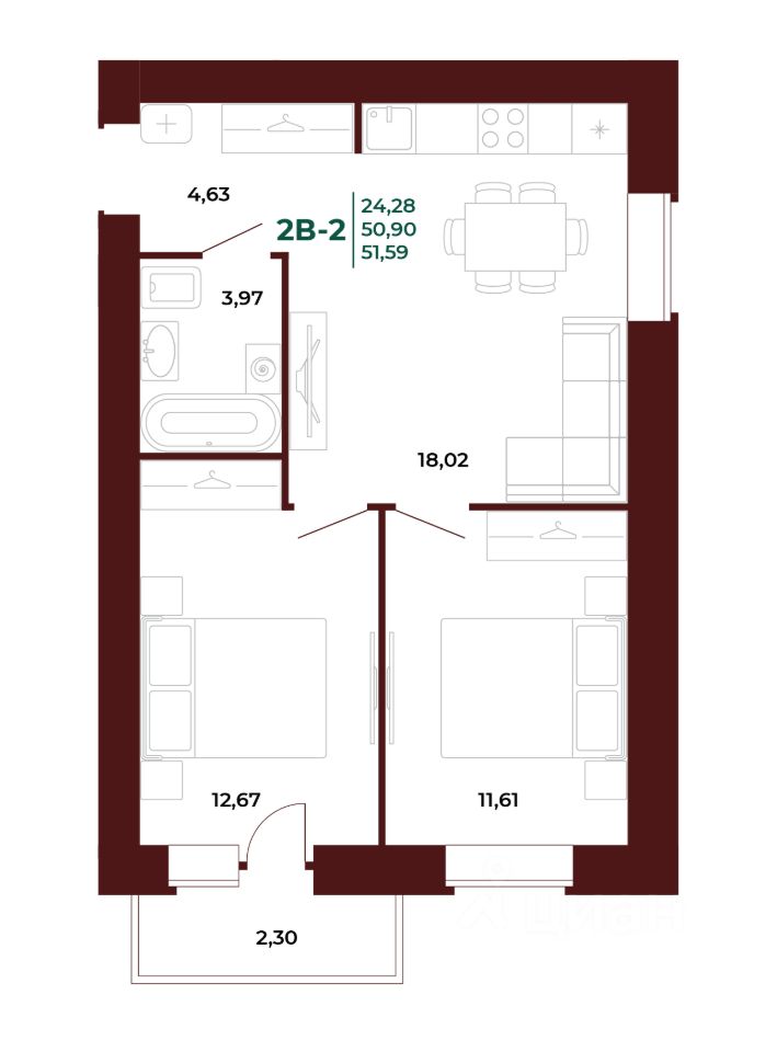 Жилая площадь25,6 м2