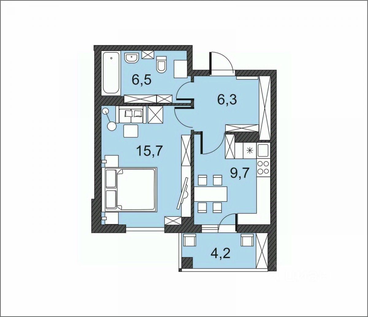 Однокомнатная квартира 42,4 м²