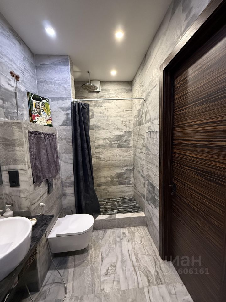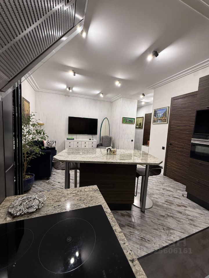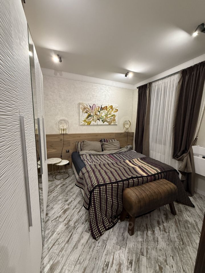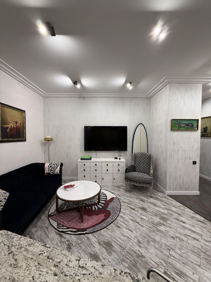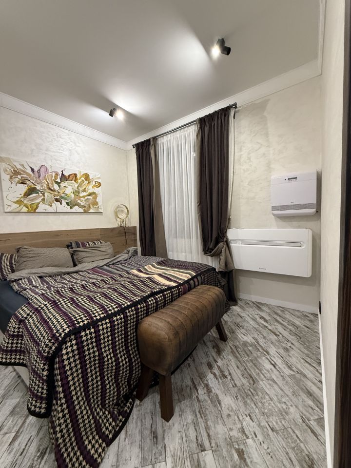 В квартире выполнен дизайнерский ремонт с использованием качественных материалов. Комната и кухня обставлены мебелью, а для вашего комфорта установлены кондиционер, холодильник, посудомоечная и стиральная машины, а также телевизор. Совмещённый санузел оборудован душевой кабиной. Окна выходят на улицу, наполняя пространство естественным светом.