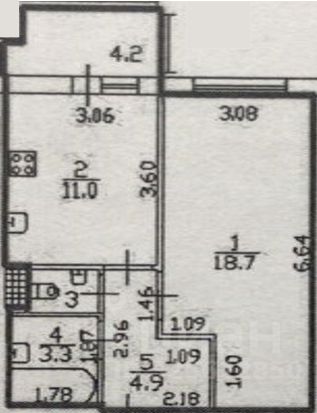 Площадь квартиры 43,4 м: - комната 18,7 м - кухня 11 м - ванная комната 3,3 м - туалет 1,3 м - коридор 4,9 м - лоджия 4,2 м