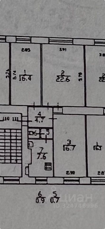 Общая площадь квартиры 69.1 кв. М., 3 изолированные комнаты площадью 16,7+ 16,4 + 22,4 кв. М., кухня 7.8 кв. М.
